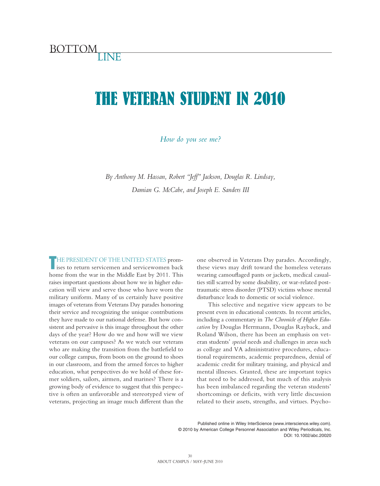 (2008 , November 21). College is for veterans, too . Chronicle of Higher Education , 55 (13 ), A99 .