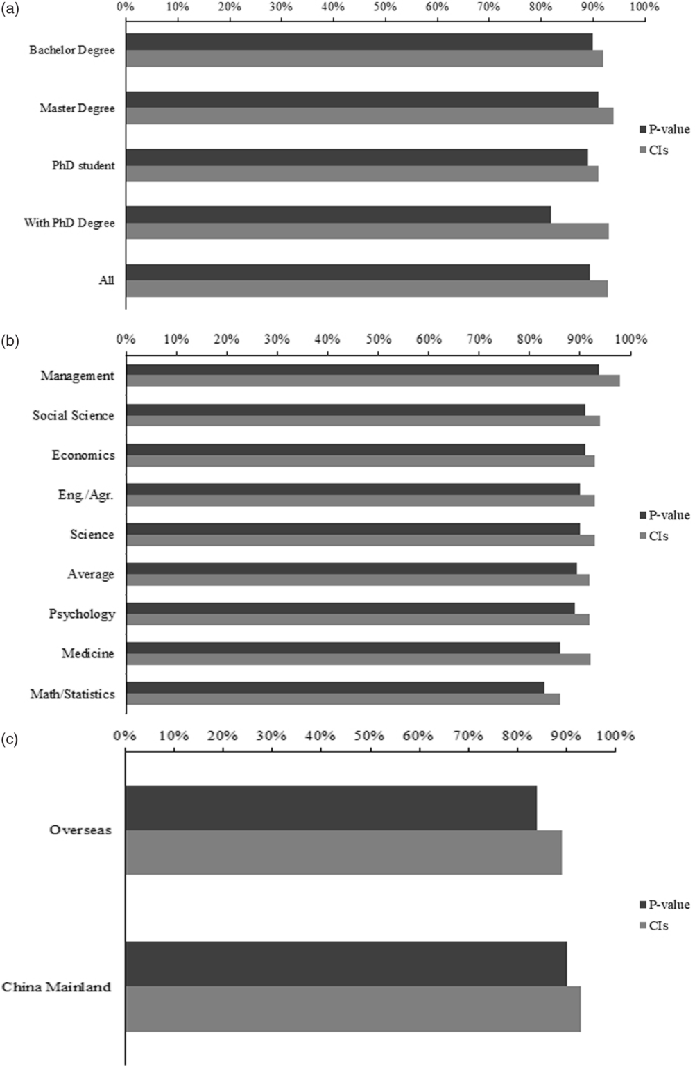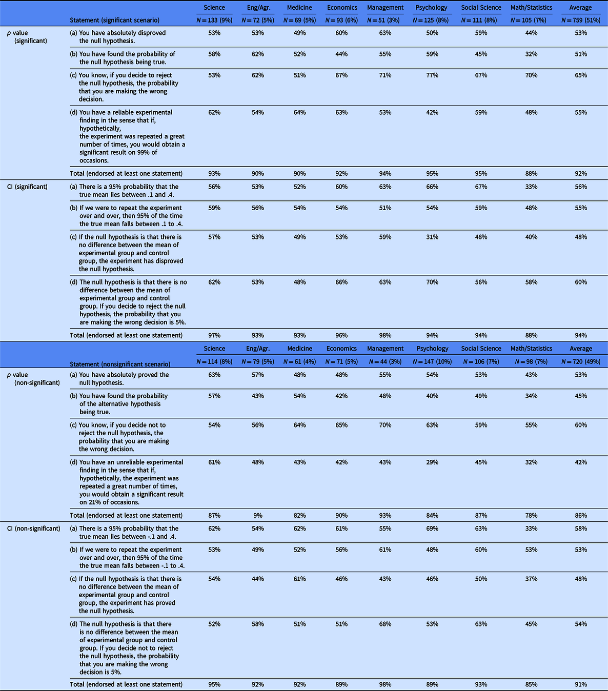 In this survey, we adopt four questions from previous studies (Gigerenzer, 2004; Haller & Krauss, 2002; Hoekstra et al., 2014) for p values and CIs. These questions were used in