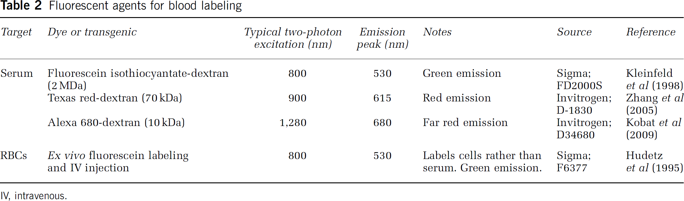 Inject 0.05 mL of 5% (w/v) fluorescent-dextran dye dissolved in saline either through a femoral artery/vein catheter, tail vein, or infraorbital vein to label the blood serum (Table 2). For tail vein or infraorbital injections, use an ultrafine 0.3-mL insulin syringe with a 29.5-G needle.