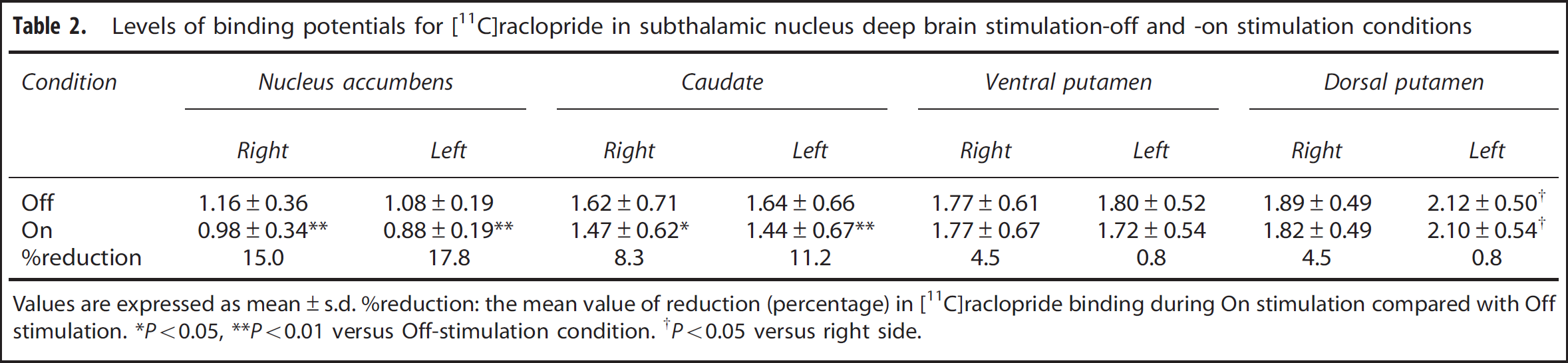 Levels of binding potentials for [11C]raclopride in subthalamic nucleus deep brain stimulation-off and -on stimulation conditions
