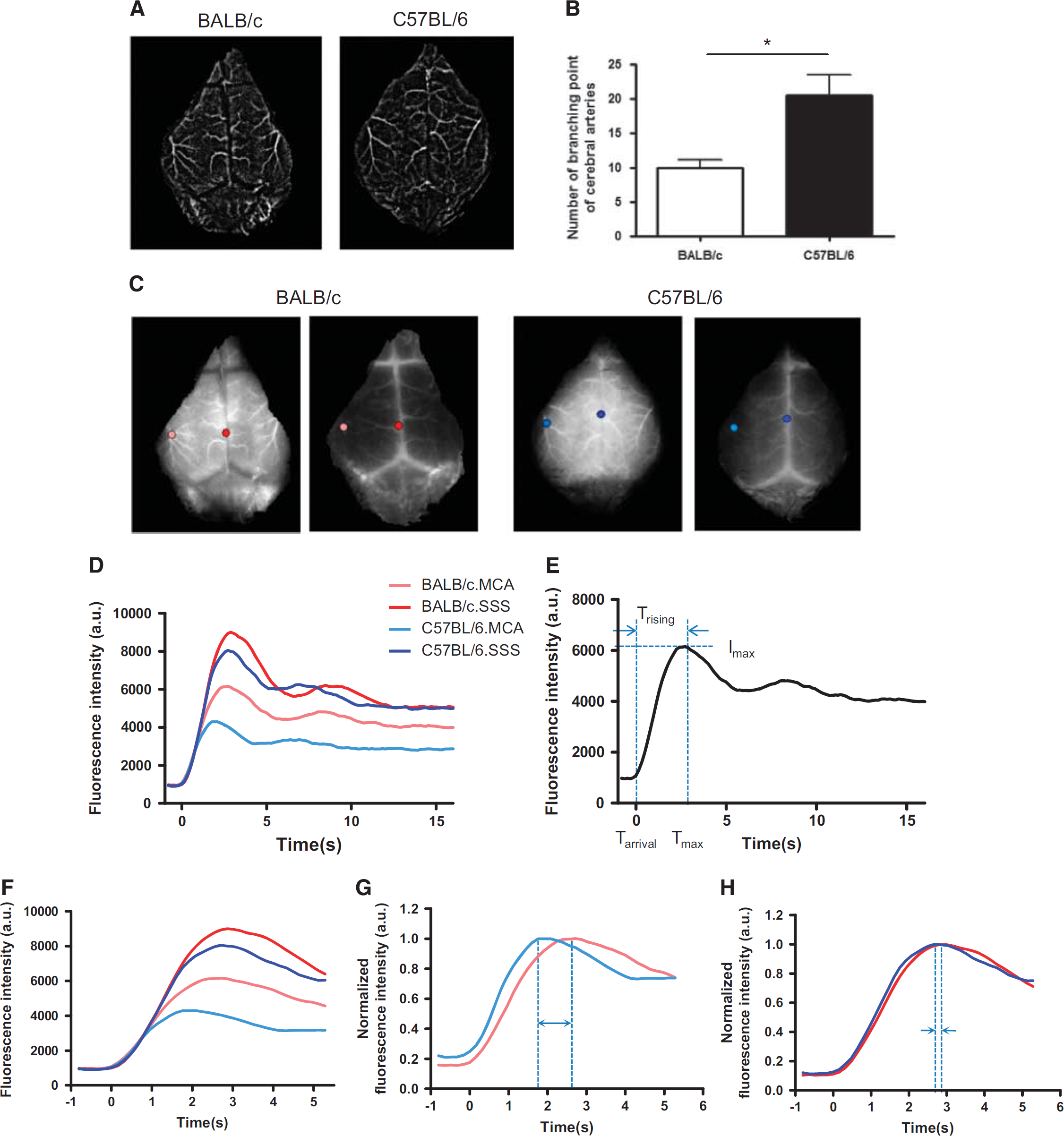 C57BL/6 mice have more cerebral arterial branches and collaterals than BALB/c mice. We measured and compared blood flow dynamics of the middle cerebral artery (MCA) in these two strains, using noninvasive optical imaging with indocyanine green (ICG). Relative maximum fluorescence intensity (