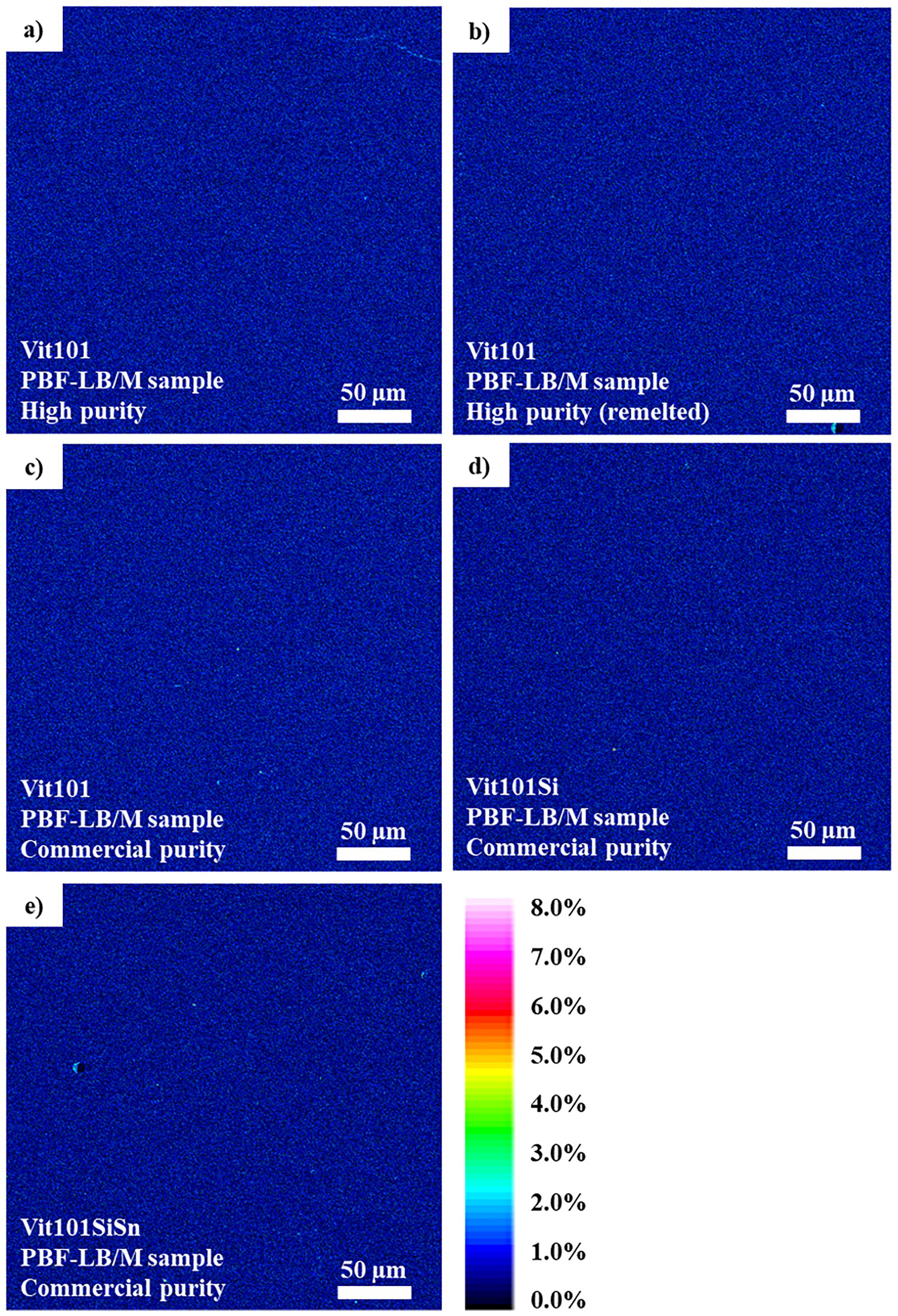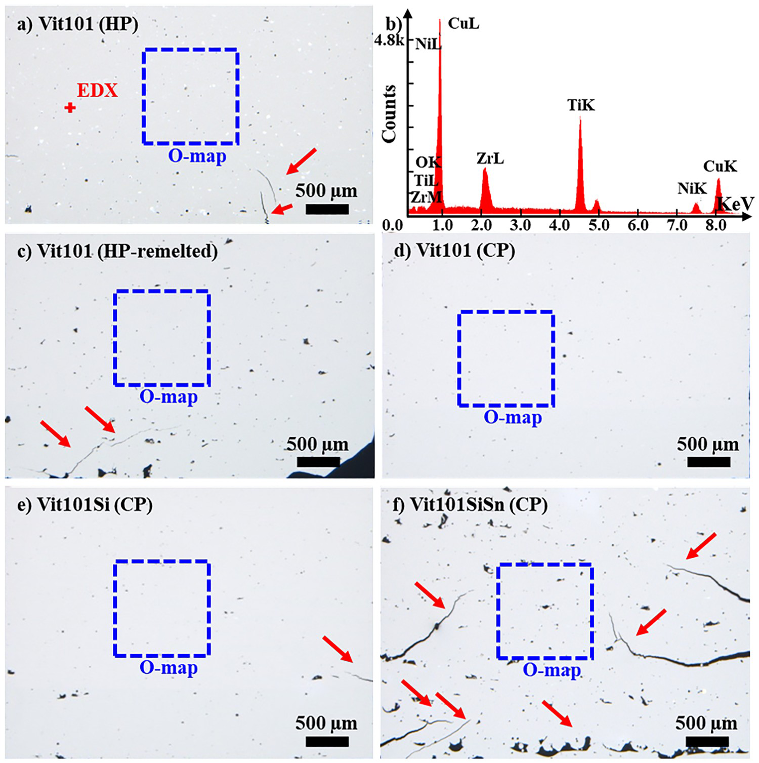 The influence of argon and vacuum drying atmospheres on the oxygen uptake of CP Vit101 and Vit101Si powders (20–63 µm) was investigated before using the powder for PBF-LB/M. Argon drying led to a final oxygen concentration of 765 ± 29 ppm for Vit101 and 750 ± 12 ppm for Vit101Si. Similarly, a vacuum atmosphere resulted in 756 ± 12 ppm and 750 ± 9 ppm, respectively. The negligible differences suggest both methods equally suffice for avoiding additional oxygen pick-up. Subsequent additive manufacturing was carried out with powder dried under vacuum. Optical microscopy was performed to determine the porosity in the manufactured samples. Figure 1 displays representative micrographs of the cross-sections along the build direction. Relative densities above 99% were obtained for all Vit101 and Vit101Si samples. The highest density of 99.8% was measured for the CP Vit101, followed by HP Vit101 and Vit101Si with 99.6%, and 99.2% for the Vit101-remelted. With only 94.9% density, the largest defect formation was observed for Vit101SiSn, evidenced by the high porosity, lack of fusion, and horizontal cracks. This finding, while preliminary, suggests that the increased degree of microalloying compromised the PBF-LB/M processability. The fracture toughness of BMGs can exhibit significant variations even with minor composition alterations [27]. Previous research reported the toughness of as-cast Vit101 to reduce with Si and Sn additions [24]. As the alloy becomes more brittle, it most likely cannot withstand the intrinsic thermal cycles of the additive manufacturing process, justifying the higher defect formation and crack propagation. Because only one set of parameters was employed, a more detailed study would be required to enhance sample densification. It is expected that a lower porosity could be obtained with a more suitable processing window and better scanning strategies. For instance, increasing the heat input into the material, i.e. the volumetric energy density ( Optical micrographs of additively manufactured samples, showing the cross-section along the build direction of (a) HP Vit101 and its representative; (b) EDX result; (c) HP remelted Vit101; and CPs (d) Vit101; (e) Vit101Si and (f) Vit101SiSn.