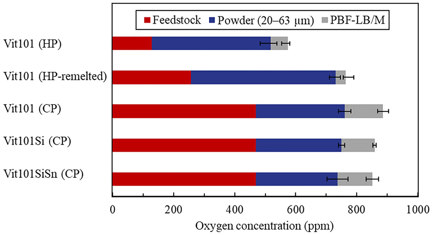 Similar oxygen concentrations were measured for Vit101, Vit101Si and Vit101SiSn of CP. The lack of influence of microalloying with Si and Sn on the oxygen uptake is in good agreement with [11].