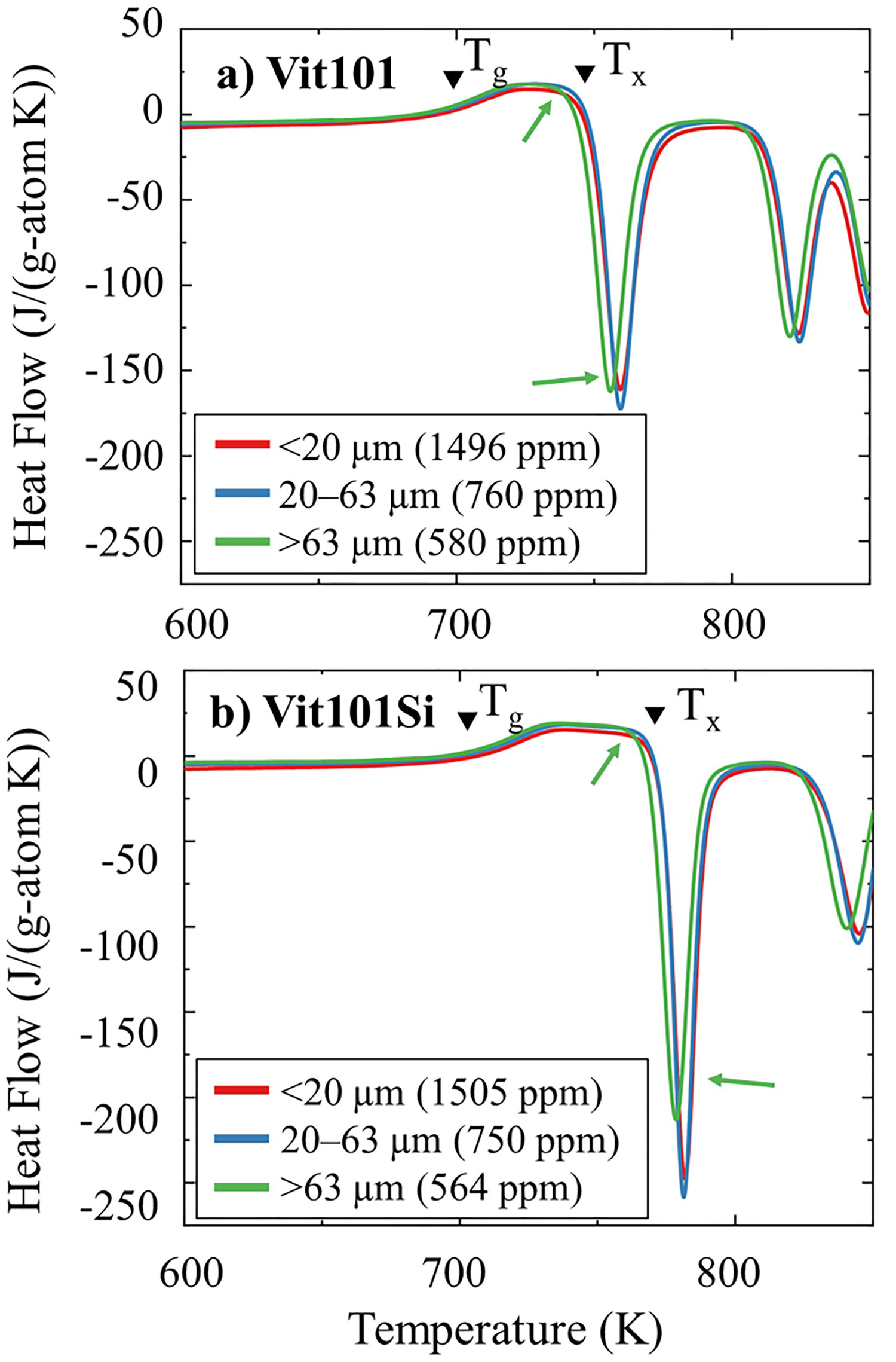 Figure 4 shows the heat flow curves obtained via continuous DSC scans of Vit101 and Vit101Si powders with CP. The onsets of glass transition ( DSC Scans of CP powders of varied class sizes (<20 µm, 23–63 µm, > 63 µm) containing different oxygen concentrations of (a) Vit101 and (b) Vit101Si alloys.