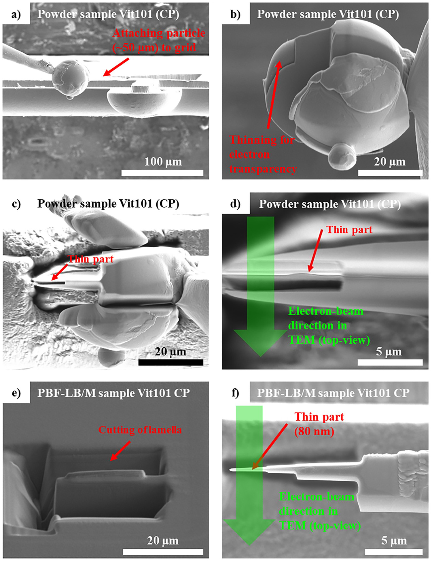 Moreover, high-resolution transmission electron microscopy (HRTEM, FEI Titan 80/300) evaluated clusters formation and (nano-) crystallisation in the CP Vit101 powder and additively manufactured sample, which presented different oxygen levels and solidification routes. Focused ion beam scanning electron microscope (FIB-SEM, FEI Nova Nanolab 200) was used for lamella preparation by lift-out method followed by low kV thinning to generate an electron transparent region with max. 100 nm total thickness.