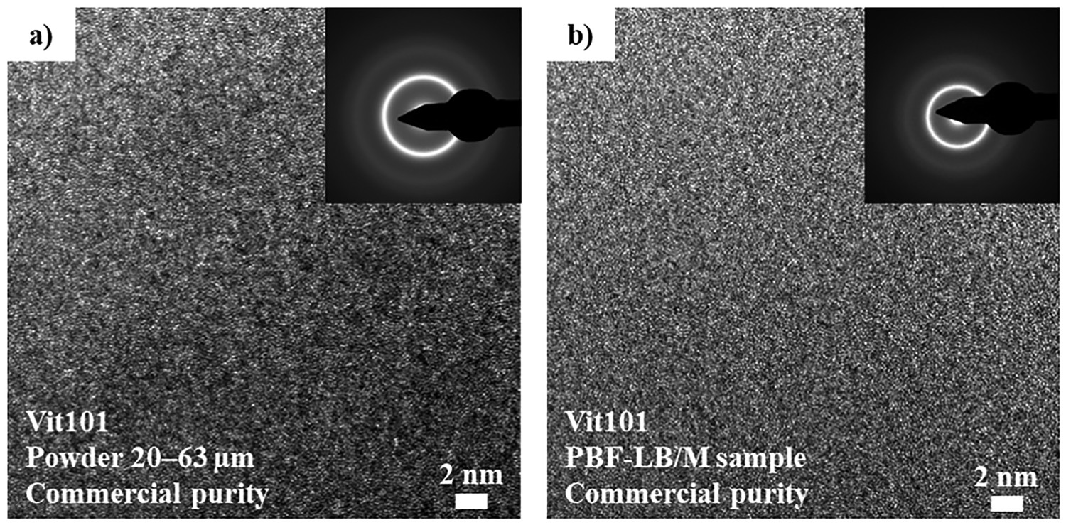 Since DSC scans and EMP maps are unsuitable for excluding the existence of low fractions of nanocrystallines, powder (20–63 µm) and PBF-LB/M samples of CP Vit101 were evaluated under high-resolution TEM to clarify possible microstructural alterations. Figure 5 displays respective site-specific images of the FIB-lamella preparation and Figure 6 the representative results as observed by HSTEM. Both bright-field micrographs are uniform and featureless, displaying the so-called salt-and-pepper contrast. Likewise, the inserts displaying the selected area diffraction (SAD) pattern show diffuse rings. These results are characteristic of a fully amorphous phase [39]. Thus the presence of oxygen-induced nucleation is rejected, despite the CP feedstock as well as cyclical heating and melting steps characteristics of the PBF-LB/M sample fabrication. As a fully-amorphous phase is reasonably expected in the AM samples with HP, complementary TEM investigation on these samples is waived. Presumably due to the lower affinity of copper to oxygen compared to Zr- and Ti-based alloys [10,11,20,23] and the lower nucleation rate as to some Zr-based alloys [38], CP feedstocks are likely sufficient for processing fully amorphous Cu–Ti–BMGs via PBF-LB/M. Studies have demonstrated that convenient laser settings suffice to provide sufficiently rapid solidification in each layer, so being able to vitrify alloys even with higher oxygen levels [21]. The results are an indication that alloys with low glass-forming ability, inherent for instance either from the alloy composition itself or the high oxygen content from CP starting feedstocks, can be printed into the amorphous state. The findings here presented evidenced the amorphous state of the PBF-LB/M sample with CP, contributing to the economic viability of these alloys at industrial scales.