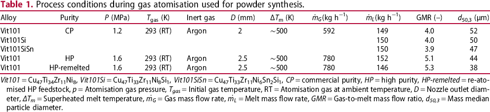 The present work evaluates the oxygen absorption during powder production via gas atomisation and additive manufacturing of HP and CP Cu–Ti-based glass formers. The impact of oxygen contamination on the GFA and amorphous phase formation is evaluated. The compositions Cu47Ti34Zr11Ni8 (Vit101), Cu47Ti33Zr11Ni8Si1 (Vit101Si) and Cu47Ti33Zr11Ni6Sn2Si1 (Vit101SiSn) were selected based on the highest GFA found for this system [24,25], besides the economic viability of starting elements.