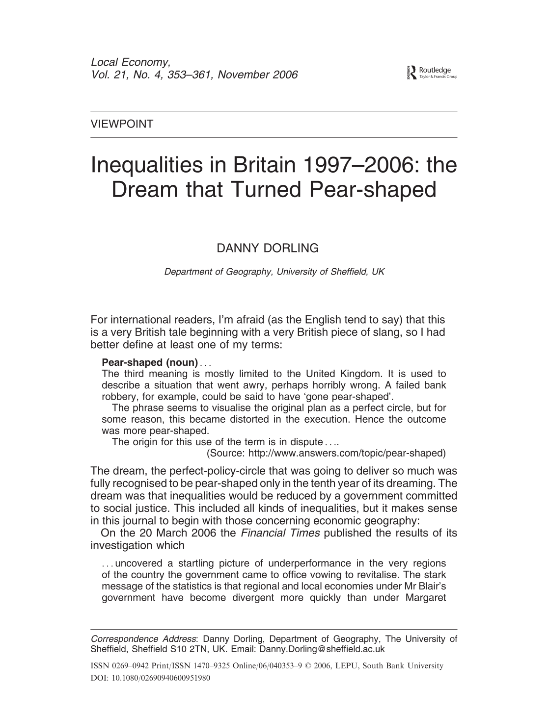 (2006 ) Forgotten Britain: how Labour has presided over a deepening divide , Financial Times , 20 March 2006 .