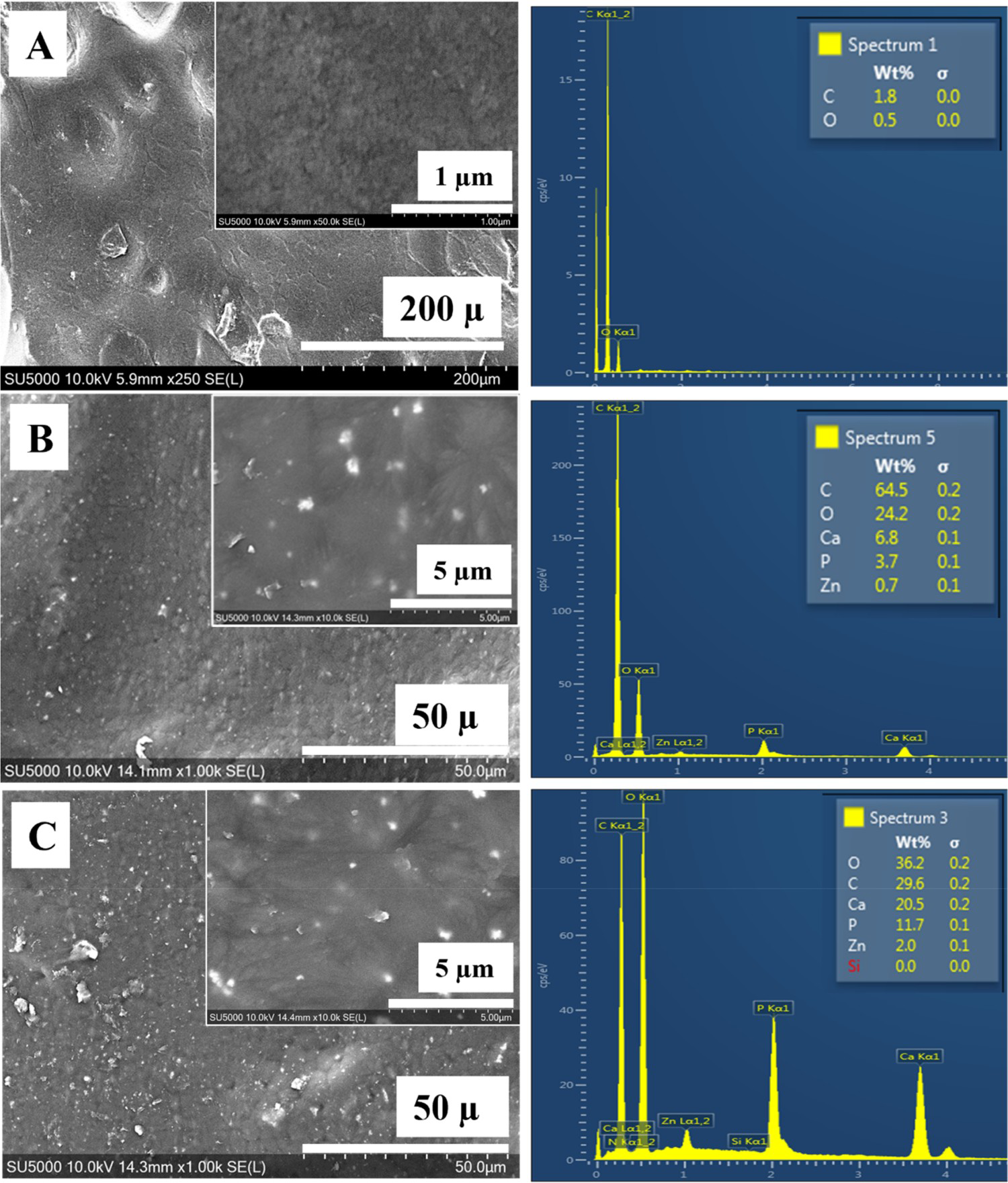 SEM micrographs of 3D printed samples showing the distribution of ZnHA particles on top surfaces and their compositional analysis by EDX: (A) PEEK, (B) PEEK/10ZnHA and (C) PEEK/20ZnHA.