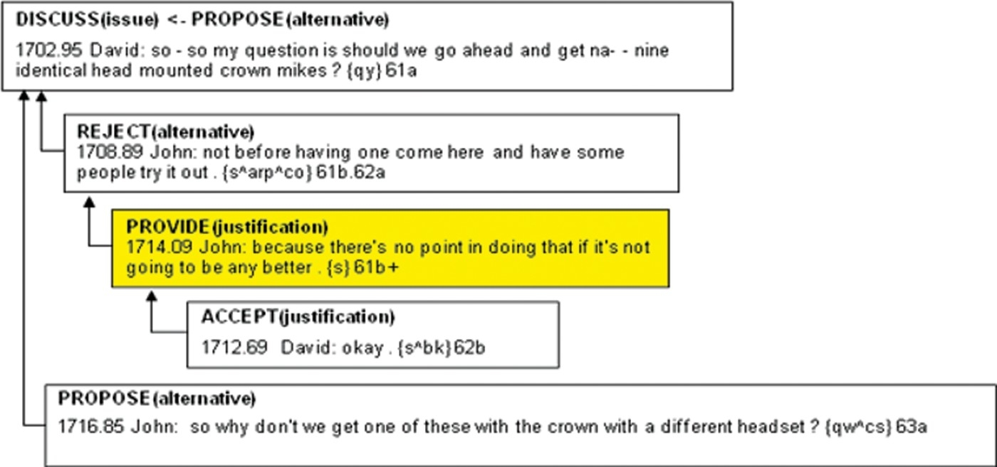 To better understand the impact of argumentative analysis in interaction mining, in this section, we will provide a real example of how argumentative indexing can solve outstanding problems in indexing and retrieval of conversational content. We illustrate the power of the MDS argumentative model presented in Section 3.3 by contrasting the limitation of classical term-based indexing for retrieving relevant content of a conversation. Consider the following conversation excerpt from the International Computer Science Institute (ICSI) meetings corpus (Janin et al. 2003):