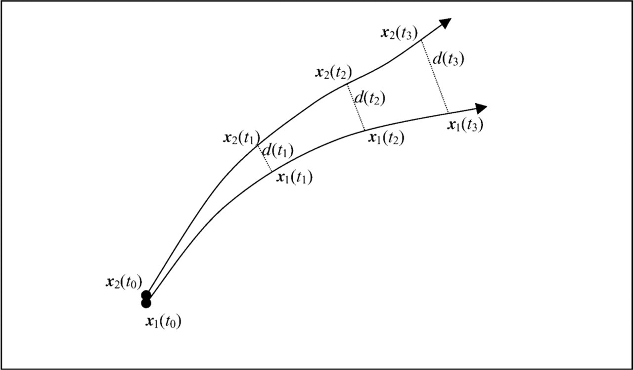 The Lyapunov exponents capture the nature of a dynamical system. Here, two orbits beginning at points