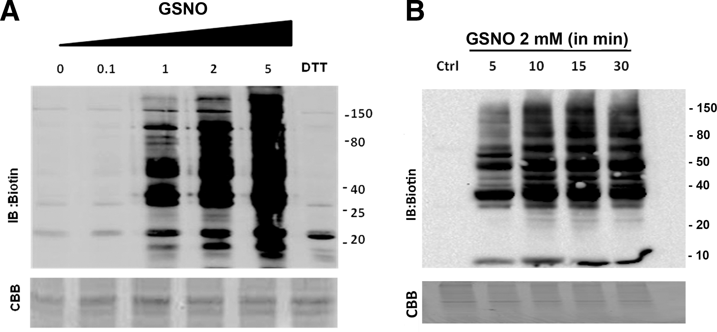 NAP-5 columns were obtained from GE Healthcare. Proteomics grade endoproteinases (Lys-C and Trypsin Gold) were purchased from Promega. HPDP-biotin (N-[6-(Biotinamido)hexyl]-3′-(2′-pyridyldithio)propionamide) was purchased from Pierce. All other chemicals or antibodies (monoclonal anti-biotin antibody, B7653; rabbit anti-mouse antibody, A9044) were purchased from Sigma-Aldrich. GSNO and DEA-NONOate concentration in the solution was determined spectrophotometrically using molar extinction coefficients of 920 M−1 cm−1 at 335 nm (GSNO) and 6700 M−1 cm−1 at 250 nm (DEA-NONOate).
