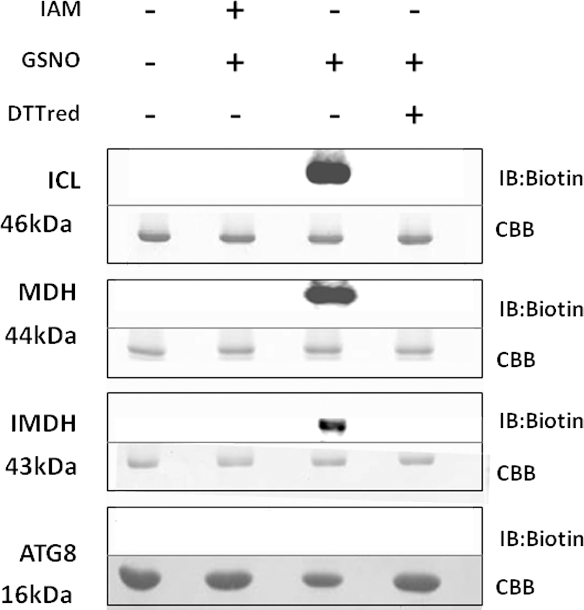 S-nitrosylation of recombinant NADP-MDH, ICL, and IPMDH in the presence of GSNO. Recombinant NADP-MDH, ICL, and IPMDH from Chlamydomonas reinhardtii and ATG8 from Saccharomyces cerevisiae were incubated with GSNO (2 mM, 15 min) or buffer (H2O) with or without prior incubation with 100 mM of IAM. The reversibility of the reaction was assessed by the treatment with 10 mM DTT for 30 min. After treatment, recombinant proteins were subjected to the BST and S-nitrosylation was visualized by anti-biotin western blot. ATG8 has no cysteine and was used as a control. IAM, iodoacetamide; NADP-MDH, NADP-dependent malate dehydrogenase.