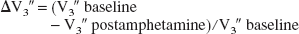 In both analyses, the reduction in D2 receptor availability after amphetamine (ΔV3″) was expressed in terms of the relative reduction in V3″: