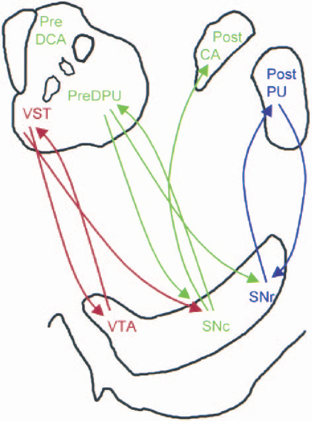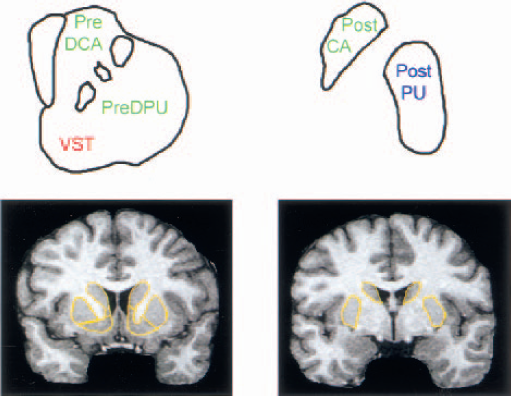 VST, ventral striatum; pre-DCA, precommissural dorsal caudate; pre-DPU, precommissural dorsal putamen post-CA, postcommissural caudate; post-PU, postcommissural putamen.