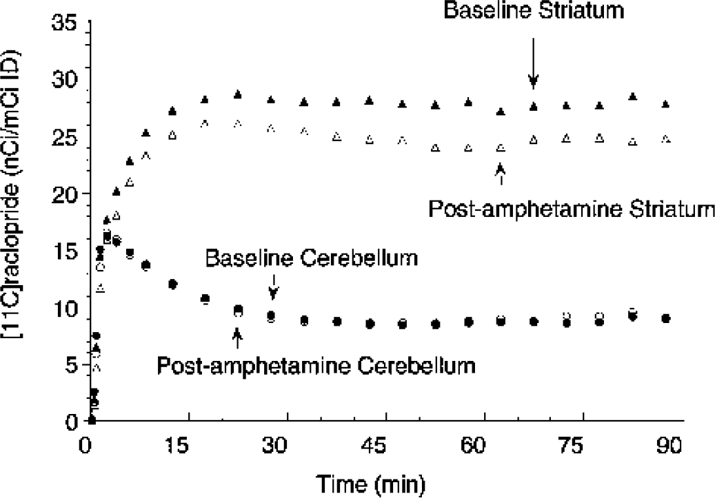 Activity in the striatum (triangles) and cerebellum (circles) during bolus plus constant infusion of [11C]raclopride at baseline (closed symbols) and after administration of amphetamine (0.3 mg/kg, open symbols). Amphetamine administration induced significant decrease in striatal activity but no change in cerebellum activity. Equilibrium measurements were obtained during the 40- to 90-minute interval.