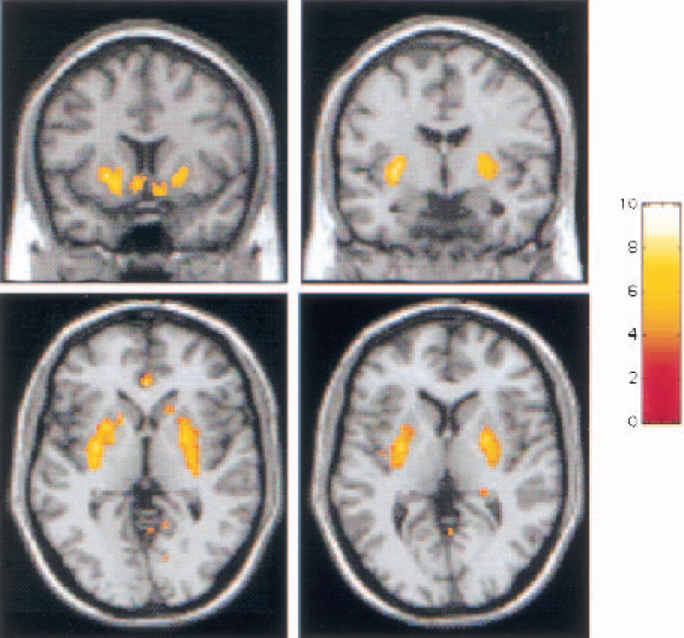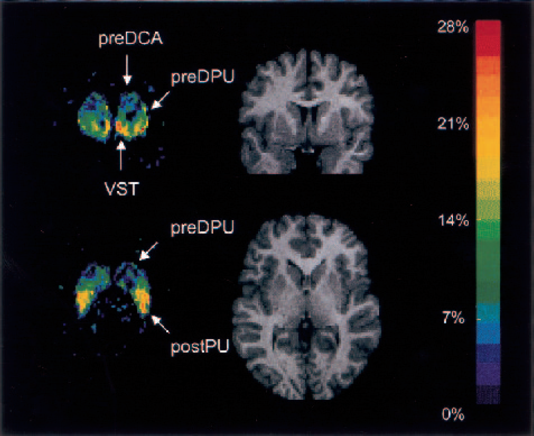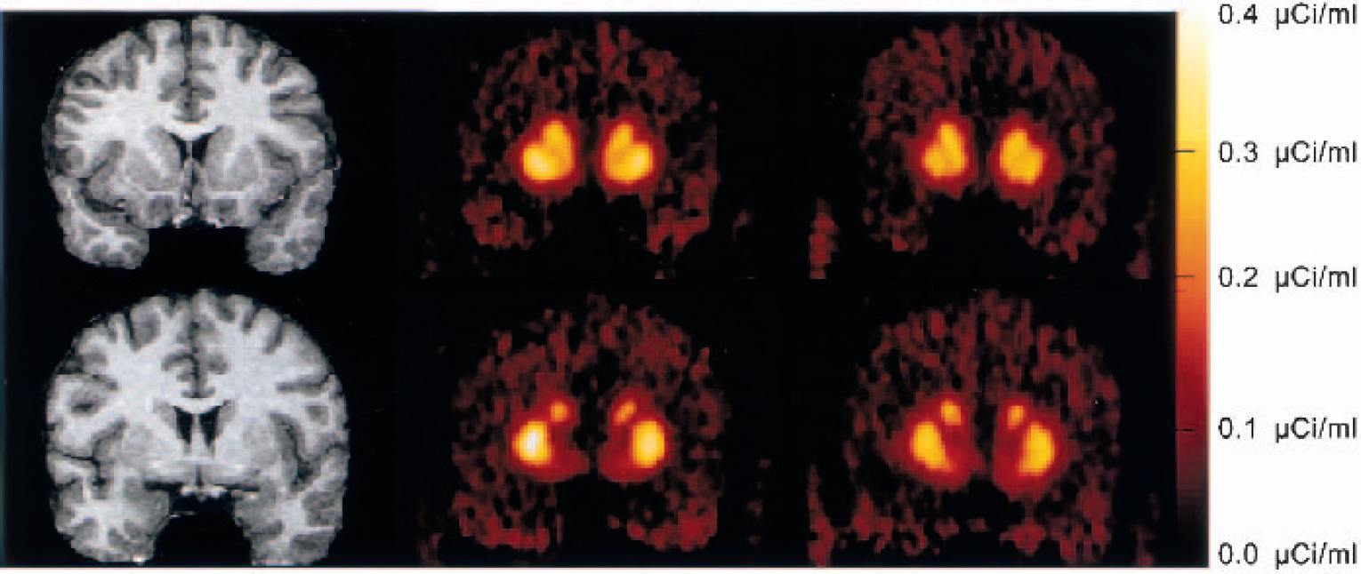 Coregistered magnetic resonance imaging scans and positron emission tomography (PET) [11C]raclopride coronal images (