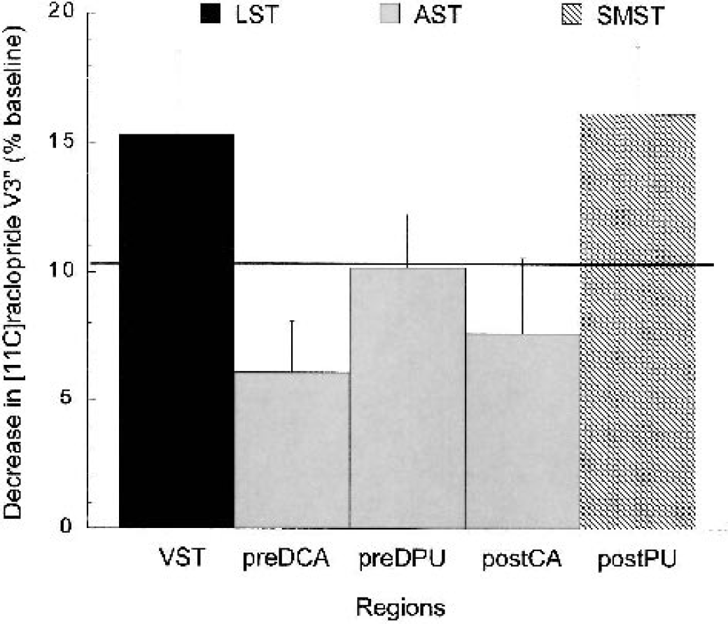 Mean ± SEM decrease in [11C]raclopride D2 receptor availability (V3″) expressed in percentage change from baseline (ΔV3″) in five subregions of the striatum in 14 healthy subjects after administration of 0.3 mg/kg amphetamine (equilibrium analysis, uncorrected for partial volume effects). Regions include: VST (ventral striatum), pre-DCA (precommissural dorsal caudate), pre-DPU (precommissural dorsal putamen), post-CA (postcommissural caudate) and post-PU (postcommissural putamen). Bar patterns represent the functional classification of these regions into limbic (black bar), associative (gray bars), and sensorimotor (striped bar) striata. The solid line represents the percent decrease seen in the striatum as a whole. Amphetamine induced significant reduction in [11C]raclopride V3″ in all regions. Significant between-region differences in the amphetamine effect were observed (