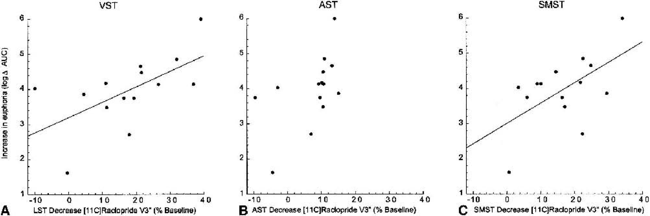 Correlation between subjective report of amphetamine-induced euphoria and decrease in [11C]raclopride V3″ in the limbic striatum (LST;