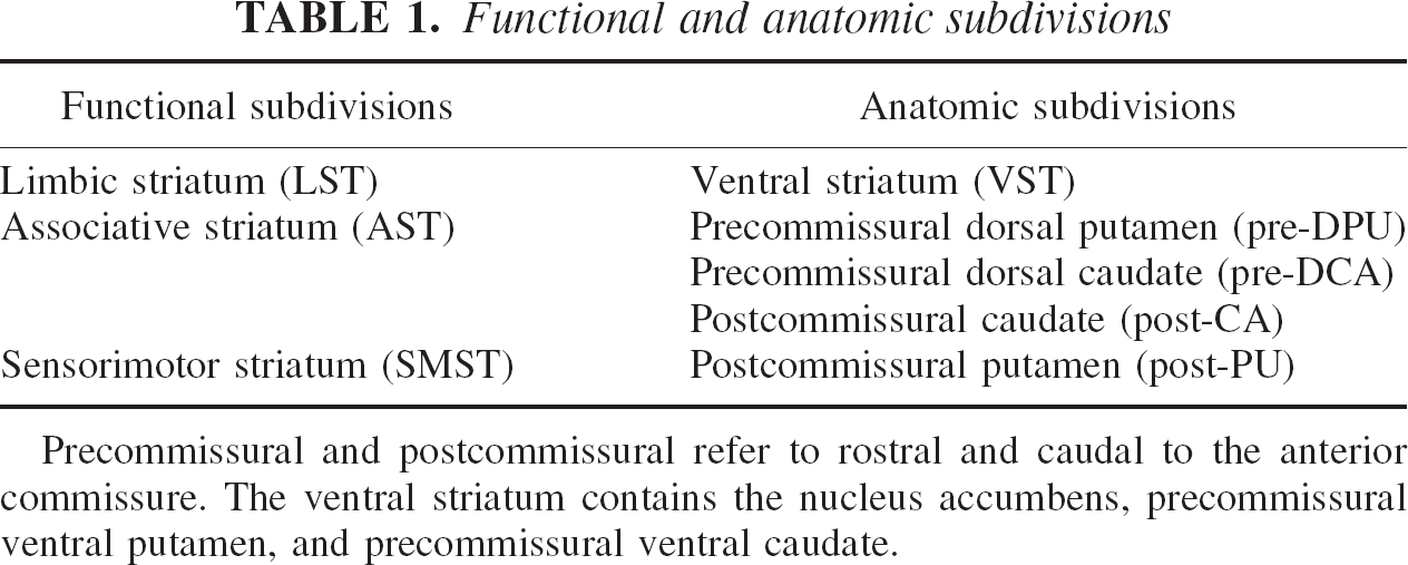 The striatum was divided into five anatomic regions of interest (ROIs) and three functional subdivisions (see Table 1 and Fig. 1).