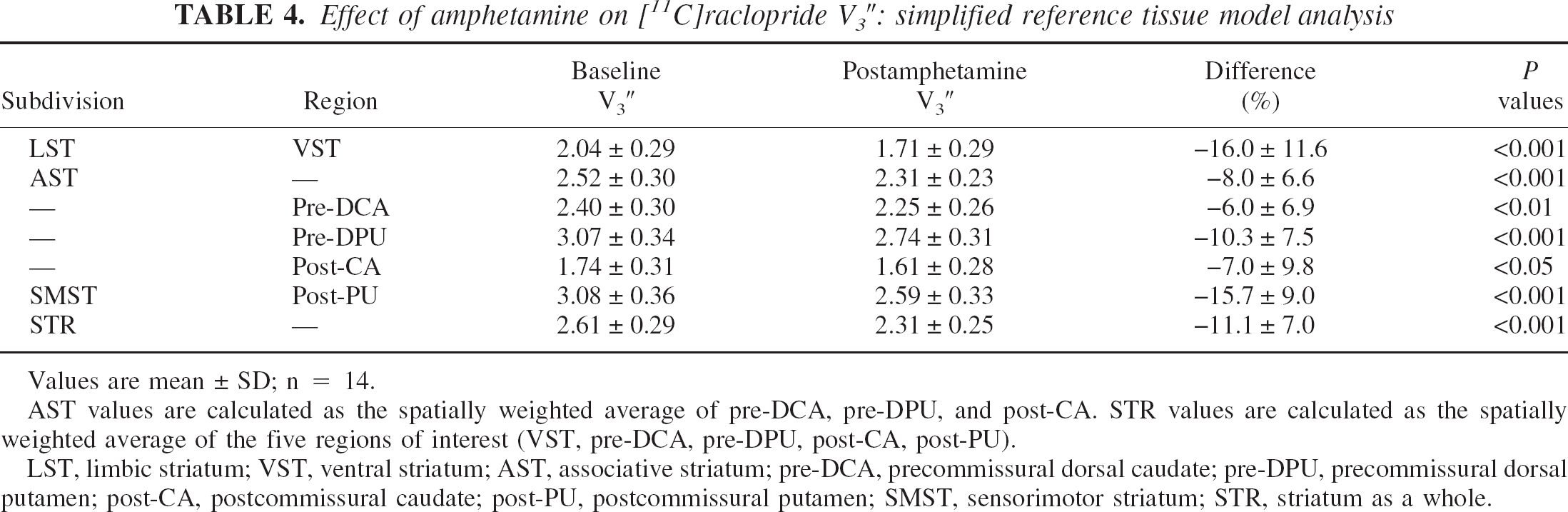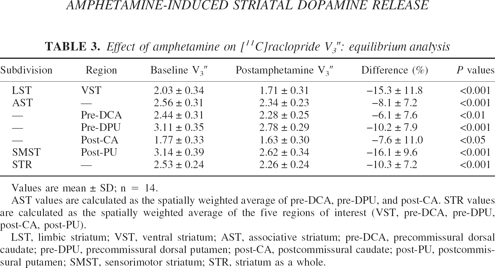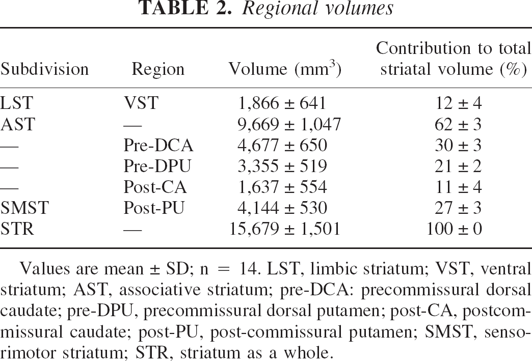 Values are mean ± SD; n = 14. LST, limbic striatum; VST, ventral striatum; AST, associative striatum; pre-DCA: precommissural dorsal caudate; pre-DPU, precommissural dorsal putamen; post-CA, postcommissural caudate; post-PU, post-commissural putamen; SMST, sensorimotor striatum; STR, striatum as a whole.