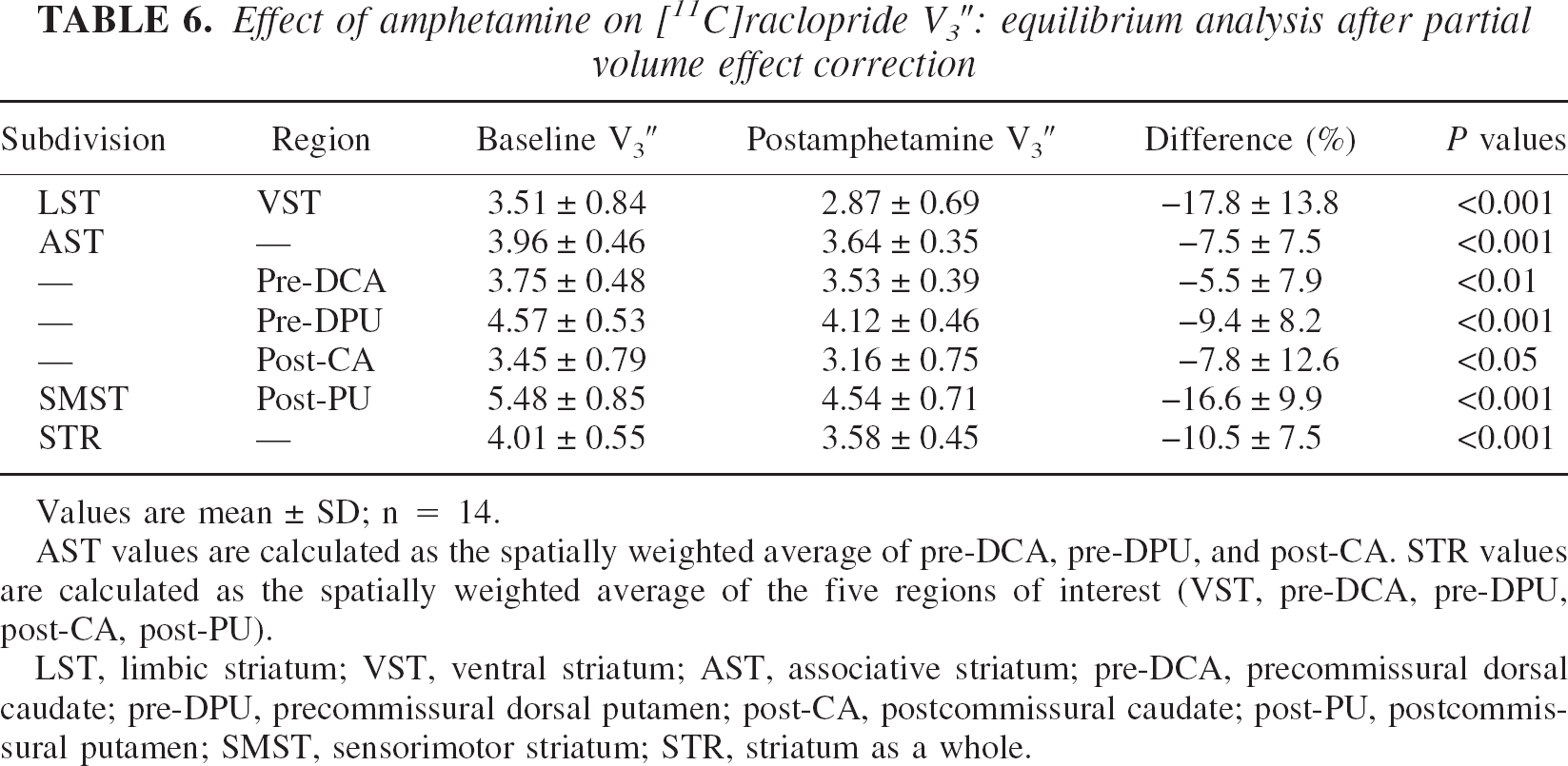Partial volume effects correction resulted in small but significant changes in ΔV3″ in the striatal subregions. Partial volume effects correction increased ΔV3″ in regions with high ΔV3″ values (VST and post-PU). In the VST, ΔV3″ increased from −15.3 ± 11.8% to −17.8 ± 13.8% (