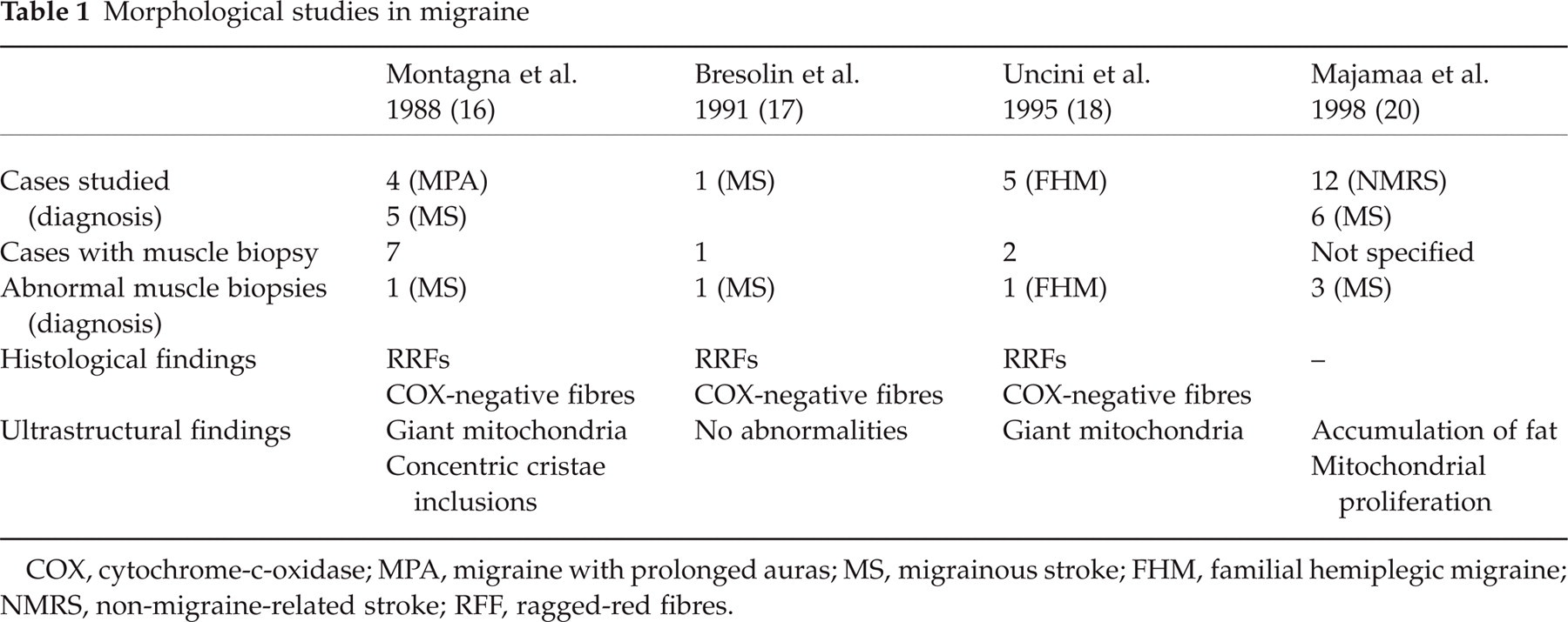 COX, cytochrome-c-oxidase; MPA, migraine with prolonged auras; MS, migrainous stroke; FHM, familial hemiplegic migraine; NMRS, non-migraine-related stroke; RFF, ragged-red fibres.