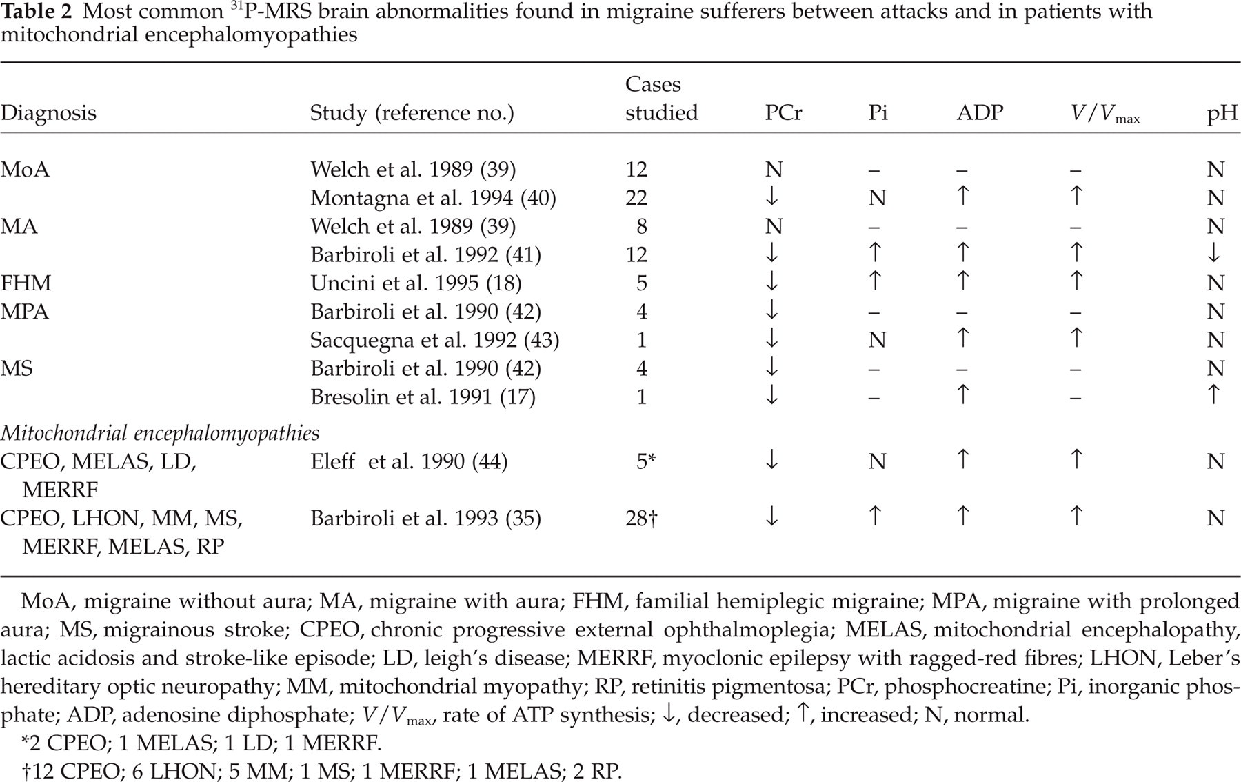 MoA, migraine without aura; MA, migraine with aura; FHM, familial hemiplegic migraine; MPA, migraine with prolonged aura; MS, migrainous stroke; CPEO, chronic progressive external ophthalmoplegia; MELAS, mitochondrial encephalopathy, lactic acidosis and stroke-like episode; LD, leigh's disease; MERRF, myoclonic epilepsy with ragged-red fibres; LHON, Leber's hereditary optic neuropathy; MM, mitochondrial myopathy; RP, retinitis pigmentosa; PCr, phosphocreatine; Pi, inorganic phosphate; ADP, adenosine diphosphate;