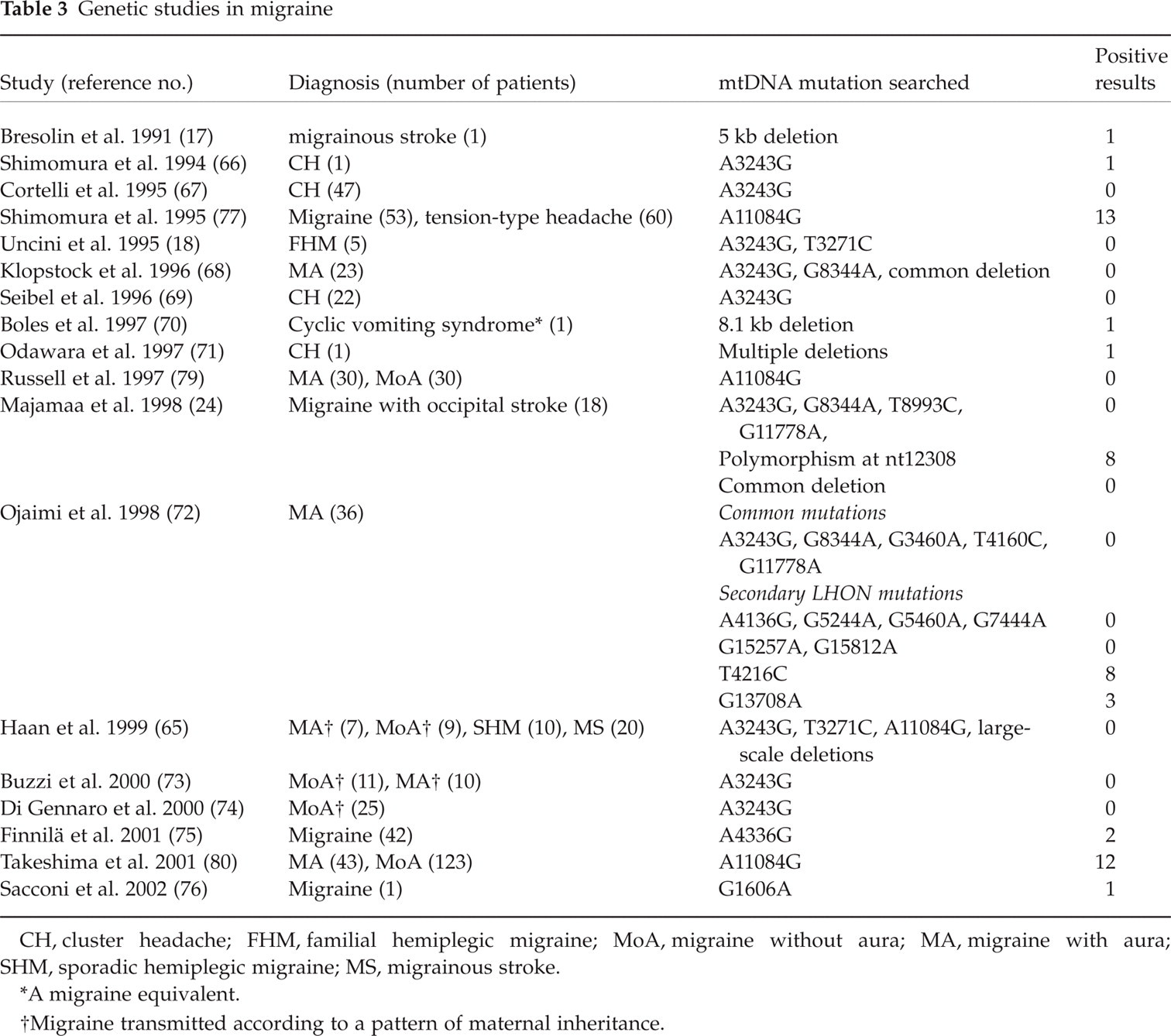 The few positive studies are limited to isolated migraineurs with mtDNA deletions (17, 70) or mtDNA point mutations (72, 75, 76) and to patients with cluster headache (CH) (66, 71) (Table 3). However, a common limitation of these studies is the clinical heterogeneity. According to Klopstock et al., cases reported in these studies usually ‘argue in favour of a syndrome beyond migraine’ (68).