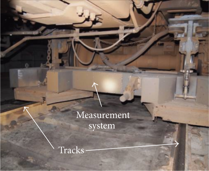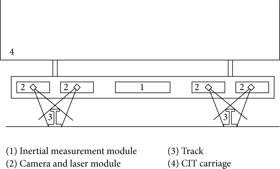 Currently in China, comprehensive inspection trains (CIT) are developed for monitoring the quality of track. Track irregularities along the railway line are recorded by various sensors in a measurement system located under the CIT carriage, as shown in Figures 1 and 2. It includes inertial measurement module and camera-laser module. Inertial measurement module contains vertical accelerometer, lateral accelerometer, roll gyroscope, and yaw gyroscope, providing the inertial reference for measuring. Camera-laser module measures the location and the shape of both tracks. Typical measurement interval for track irregularities is 0.25 m. At each measurement point, seven types of track irregularities (vertical irregularity, alignment irregularity, gauge, cross-level irregularity, warp, vertical acceleration, and lateral acceleration) are recorded, processed, and stored by computers onboard.