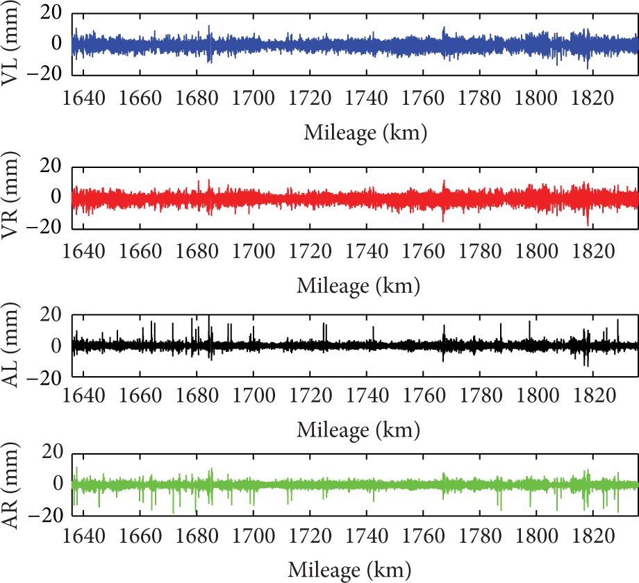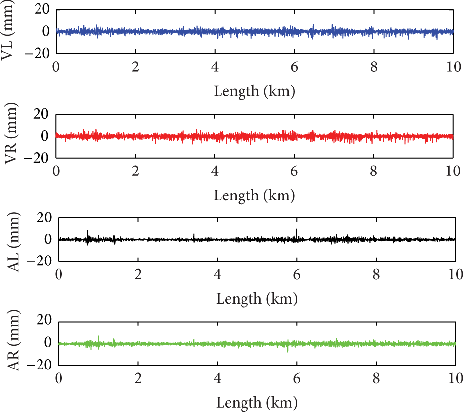 Researches were carried out to study the properties of track irregularity on conventional and high-speed railways, with both time and frequency domain analysis. As a widely used method, power spectral density (PSD) of the random track irregularities is calculated as a statistical characterization [2–4]. Random field theory along with the level crossing theory was also used to analyze a section of Indian railway; models of Gaussian vertical and lateral track irregularity data are established. Peak values in a given track section can be predicted by this model too [5–7]. High-speed railway in China has been studied extensively in the last decades. Test data from Beijing-Tianjin Inter-City Railway was analyzed on the frequency domain. Track irregularities with different wavelengths components were presented and compared with the German railway. It indicates that some periodic components can be expected in track irregularity data, for which the current method does not consider [8]. Track irregularity standard deviation time series data and the characteristics and trend changes of track state are studied by applying clustering analysis, and this method can be used to predict the changes of TQI and state of the track [9, 10]. Track irregularities of Beijing-Shanghai high-speed railway are also extensively analyzed. Sections of this high-speed railway with Gaussian nature can be modeled by using the level crossing theory, but this method cannot solve the non-Gaussian random process [11]. Furthermore, the train-track system can be modeled in simulation model using SIMPACK software based on the irregularity data [12] or by pseudoexcitation method [13].