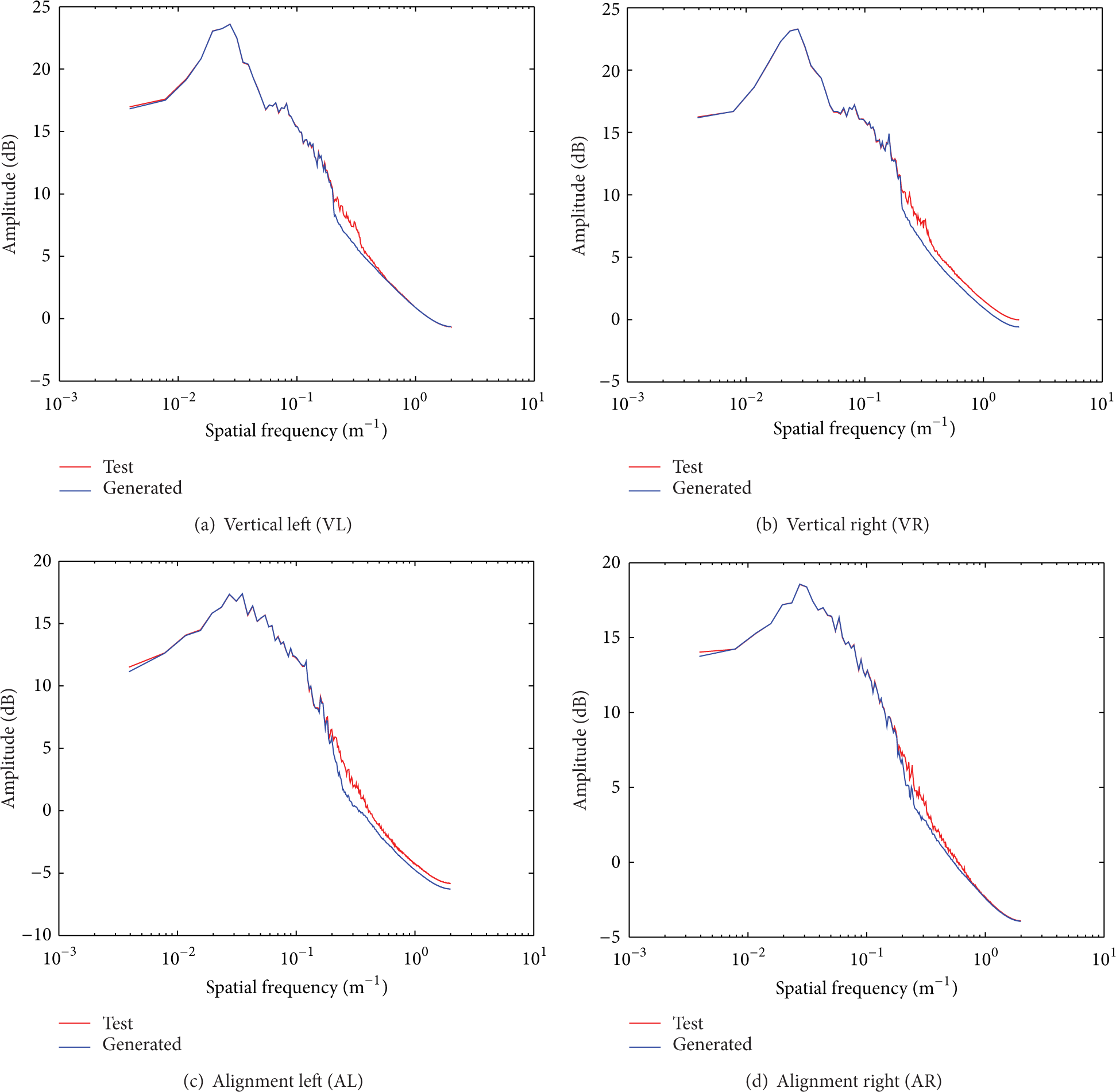 As mentioned before, characteristics of track irregularities in frequency domain are extremely important for description of random process and further simulation research. The mean power spectral density (PSD) of test data and generated data,
