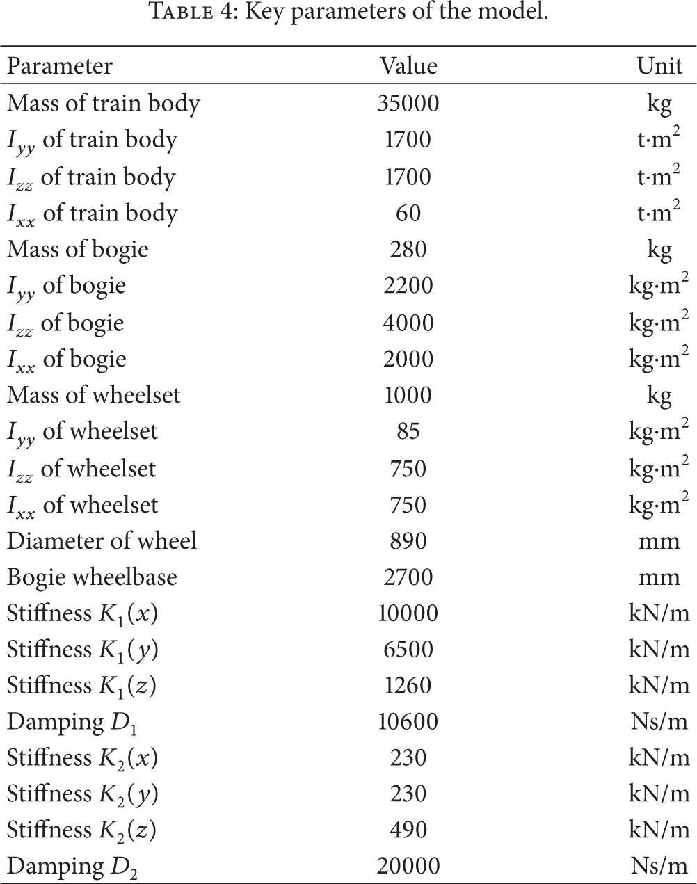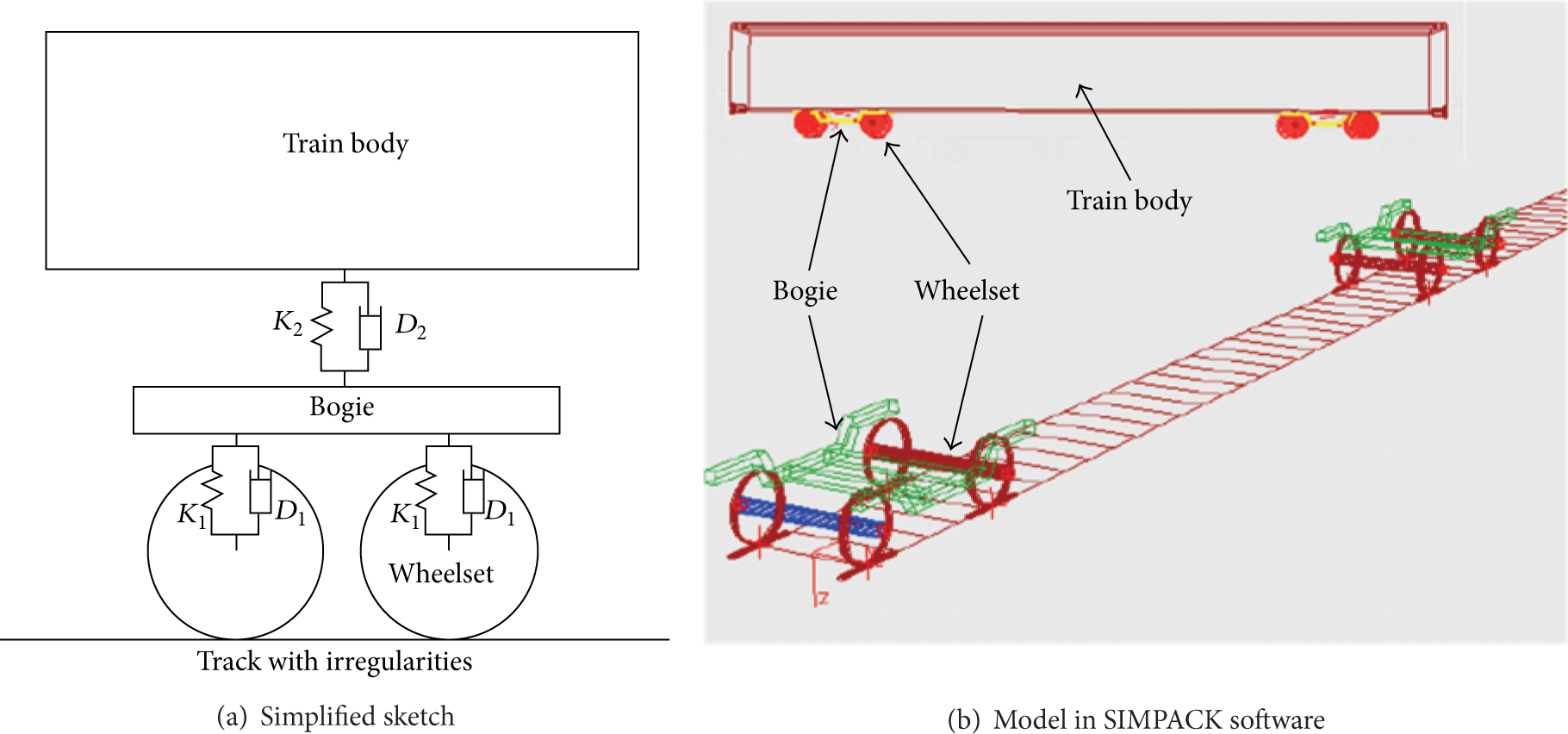 An important application for the generated track geometry is that it can serve as the critical input in dynamic simulation of train-track system. In SIMPACK software, a multibody model of the train is established. Figure 8 shows the simplified sketch of the model and its representation in SIMPACK software. The train parameters in the model are configured the same as the CRH train in operation. Some key parameters are presented in Table 4 (