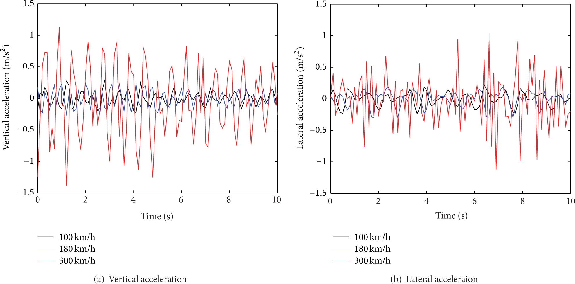 The vertical acceleration of the train body can be easily perceived by the passengers, thus making it a critical indicator for comfort. Using the dynamic model and the track geometry generated above, it is easy to carry out simulations under different traveling velocities. Simulations are repeated with traveling velocity set as 100 km/h and 300 km/h. Results are shown in Table 6, and a typical section of vertical and lateral accelerations is plotted in Figure 9. Results shown in both numbers and figures indicate that when the traveling velocity increases from 100 km/h to 300 km/h, the amplitudes of acceleration increase significantly. Since accelerations of train body and wheels are important factors related to derailment risk of the train, research on detailed relationship between traveling velocity and acceleration responses and a parametric study could be interesting topics for future works.
