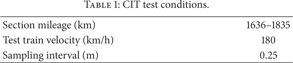 A case study of track irregularities in Beijing-Guangzhou high-speed railway is carried out. As the longest high-speed railway line all over the world, the structure of 32 m-span continuous viaduct is widely used, which consists of 81% length of the entire Beijing-Guangzhou high-speed railway [19]. It also features the maximum operation speed in China, 350 km/h. The test data studied in this case study was recorded by a comprehensive inspection train (CIT) in June 2013. The test conditions are shown in Table 1.