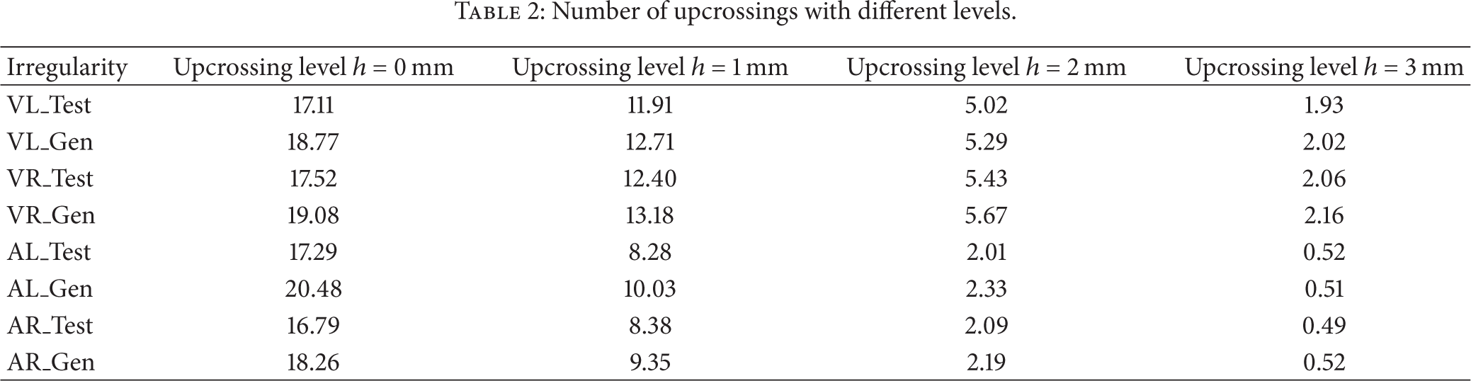 In Table 2, average number of upcrossings of different level