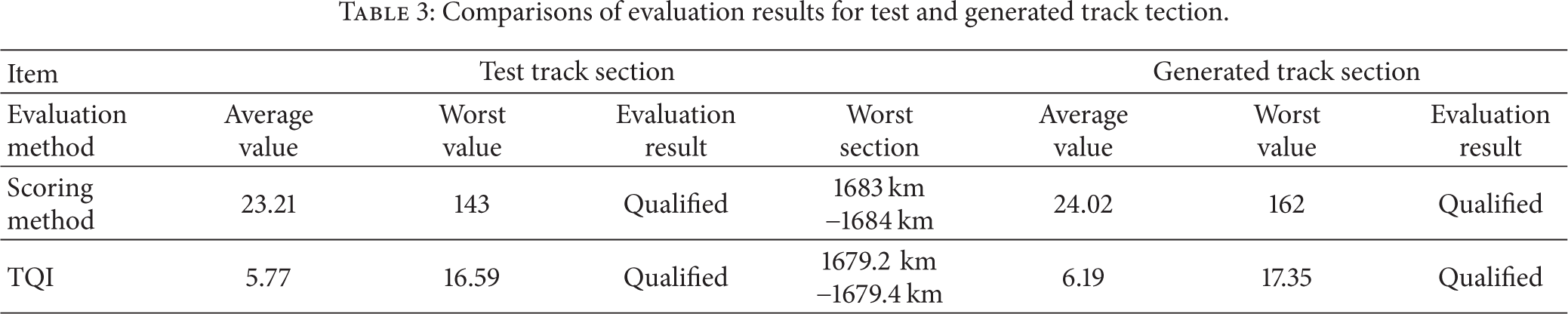 Furthermore, the current evaluation methods are applied to the generated track section; the results are shown in Table 3. Compared to the result of the original test data, the evaluation values are similar. And both results show a qualified track section according to the evaluation standard. But the generated data given by the K-L expansion cannot provide the information of the critical positions on the track, since this method only focuses on the global feature but not on the local one.