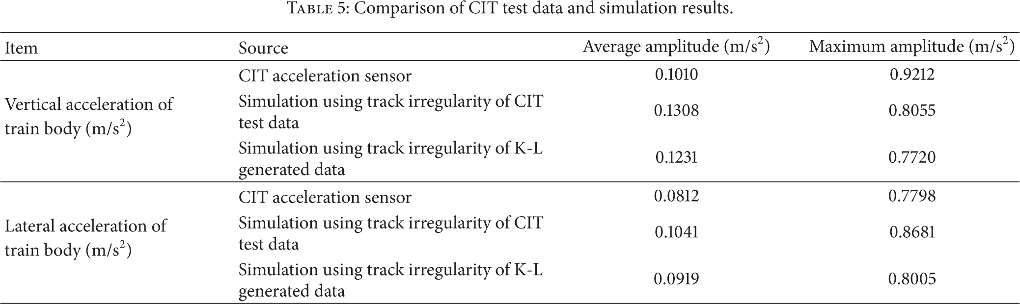The dynamic response of the high-speed train under different traveling velocity is studied in this simulation. The traveling velocity of the train is set the same as the CIT test condition in Section 3.1, which is 180 km/h. Track section with irregularity directly measured by CIT shown in Figure 3 and those irregularities generated by K-L approach in Section 3.2 are applied as the input track geometry. The simulation results of accelerations of the train body are shown in Table 5 and are compared with data from CIT acceleration sensors. The comparison of vertical and lateral acceleration of the train body shows that the statistics of accelerations using different inputs match each other. This result provides an additional dynamic verification of K-L generated data besides the statistical and frequency verification in Section 3.3.