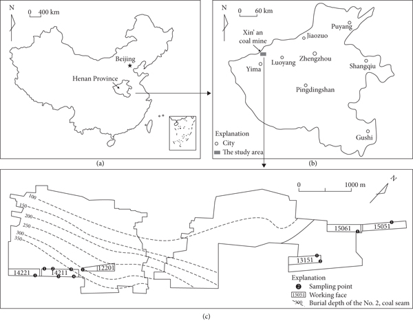 (a) Location of the Henan Province. (b) Location of the Xin’an coal mine. (c) Map showing sampling points, working faces, and burial depth of the No. 21 coal in mining area of the Xin’an coal mine.