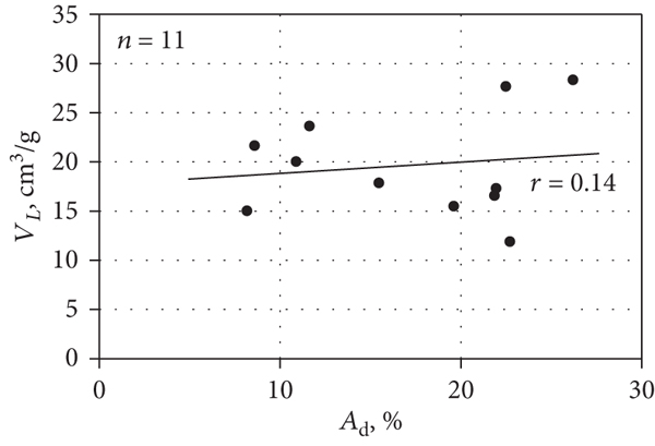 Inorganic matter (as indicated by ash content) plays a critical role in methane adsorption capacity [8, 10, 19, 25, 44, 68, 72–74]. Ash content of studied samples ranges from 8.16% to 26.26% (Table 1), which is classified as special low ash to medium ash coal according to Chinese National Standard GB/T 15224.1-2010 (Ash yield <10% for special low ash coal, 10.01-20% for low ash coal, and 20.01-30% for medium ash coal). There is a positive association between ash content and methane adsorption capacity but the relationship lacks statistical significance (