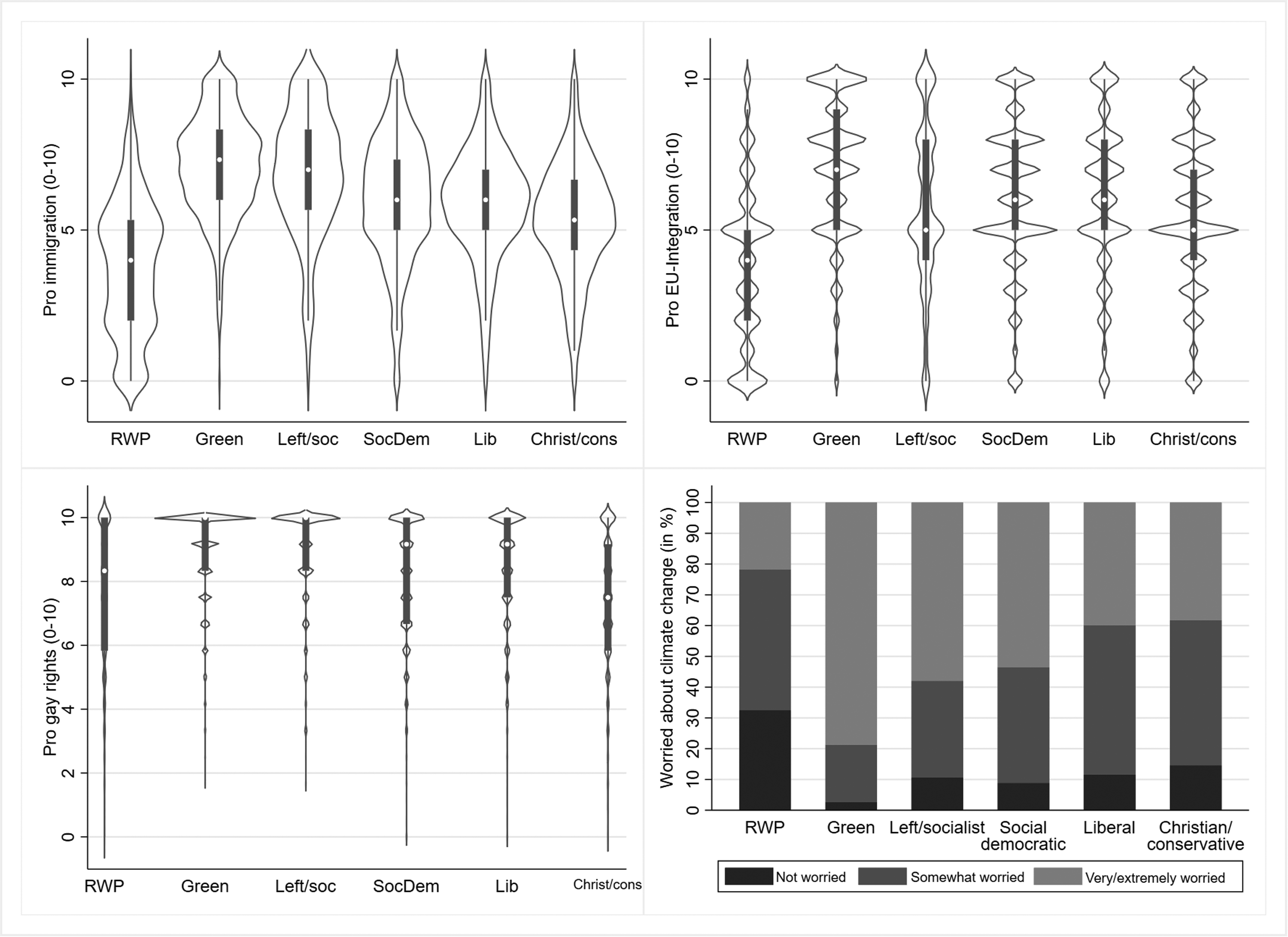 Figure 1 shows the distribution of the support for immigration, EU integration and gay rights, as well as concern about climate change for voters of each party family. The RWP electorate is considerably more opposed to immigration and EU integration than voters of other party families. When it comes to gay rights, they differ less from the other groups and even agree slightly more than Christian/conservative voters. In terms of concern about climate change, RWP voters have by far the highest proportion of people who are not concerned (∼35%) and the lowest proportion of people who are very or extremely concerned (∼20%). In comparison, around 80% of Green voters are very or extremely worried about climate change, and only a very small fraction of less than 5% are not (very) worried. Voters of other parties fall somewhere in between, with around 10 to 15% not (very) worried and around 40 to 60% very or extremely worried about climate change. Green voters show the strongest support for EU integration, while all other parties fall somewhere between Green and RWP voters. When it comes to attitudes to immigration and gay rights, Green voters are the most supportive, together with voters of left/socialist parties. Voters of all other parties are considerably less supportive of immigration, while the differences in support for gay rights are less pronounced.