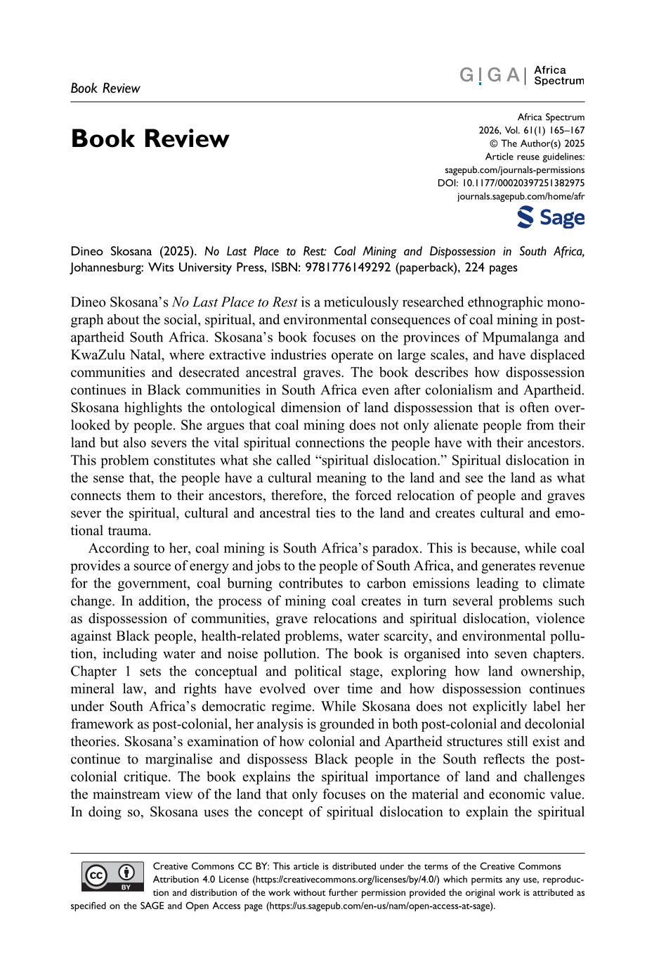 According to her, coal mining is South Africa's paradox. This is because, while coal provides a source of energy and jobs to the people of South Africa, and generates revenue for the government, coal burning contributes to carbon emissions leading to climate change. In addition, the process of mining coal creates in turn several problems such as dispossession of communities, grave relocations and spiritual dislocation, violence against Black people, health-related problems, water scarcity, and environmental pollution, including water and noise pollution. The book is organised into seven chapters. Chapter 1 sets the conceptual and political stage, exploring how land ownership, mineral law, and rights have evolved over time and how dispossession continues under South Africa's democratic regime. While Skosana does not explicitly label her framework as post-colonial, her analysis is grounded in both post-colonial and decolonial theories. Skosana's examination of how colonial and Apartheid structures still exist and continue to marginalise and dispossess Black people in the South reflects the post-colonial critique. The book explains the spiritual importance of land and challenges the mainstream view of the land that only focuses on the material and economic value. In doing so, Skosana uses the concept of spiritual dislocation to explain the spiritual impacts of mining by disclosing how mining activities generate spiritual issues and not only material losses.