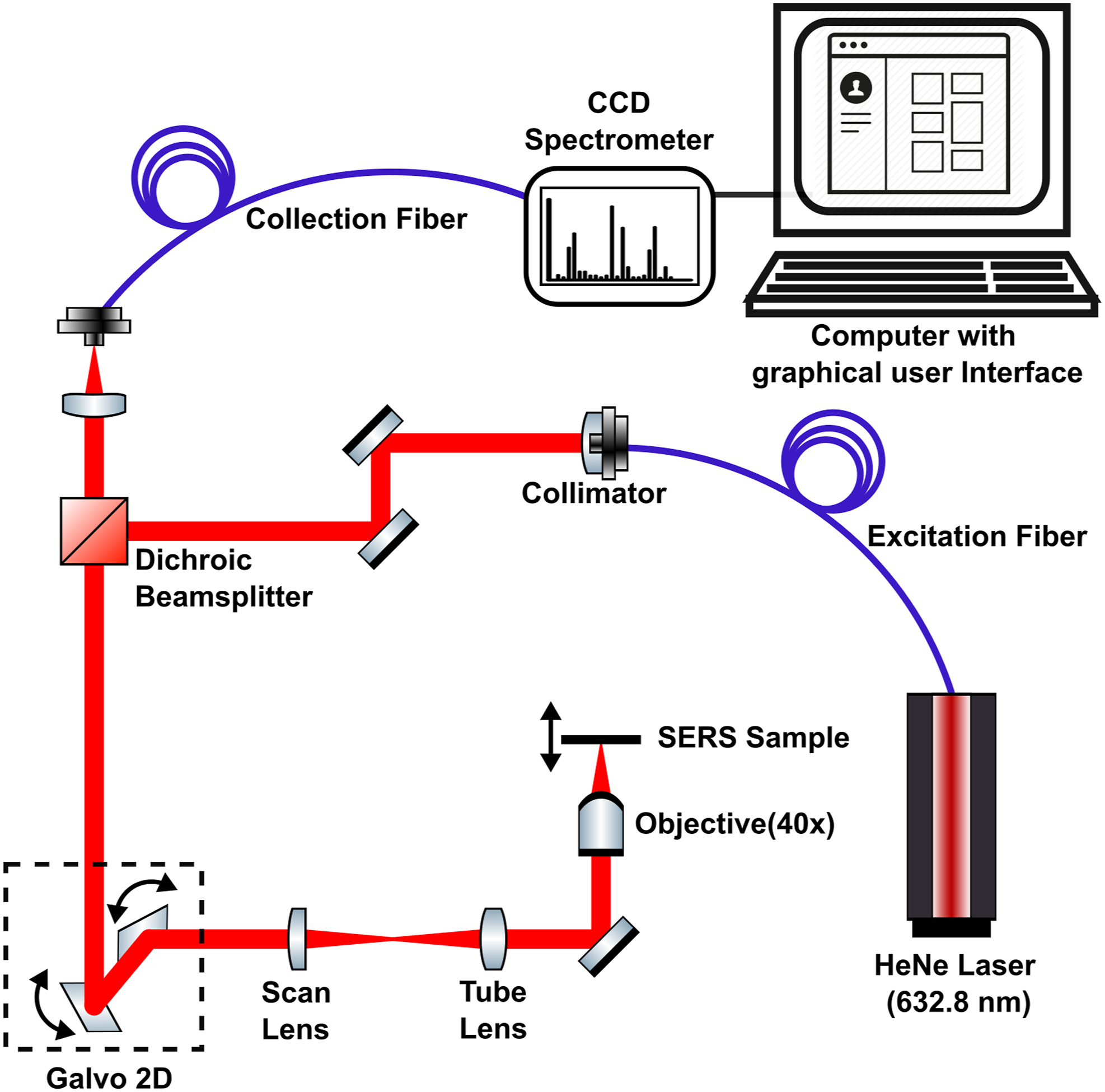 A laboratory-made confocal Raman microscope was used for SERS measurements and is presented in Fig. 1. The excitation light source consisted of a 10 mW He–Ne laser (632.8 nm) injected into a single-mode optical fiber. An Olympus NiFluorite objective (M = 40 X, NA = 0.75) was used to excite the sample with an incident power of (2.8 ± 0.3) mW measured at the sample location. A galvanometer-based laser scanning apparatus allowed the interrogation of large areas more rapidly than a sample-scanning setup. A compact spectrometer (Fergie, Princeton Instruments) featuring a 1180 lines/mm grating blazed at 750 nm (spectral resolution ≅ 0.22 nm) and a near-infrared-enhanced charge-coupled device (CCD) detector cooled at −55 °C was connected to the microscope using a multimode fiber (OZ Optics) that also served as the microscope pinhole (φ = 50 µm). CCD images were acquired with a 5 s integration time and binned into 1 × 1024 spectra. The spectral range covered by the spectrometer in this configuration was 650–780 nm (416–3100 cm−1). Diagram of the laboratory-made confocal Raman microscope used in this work.