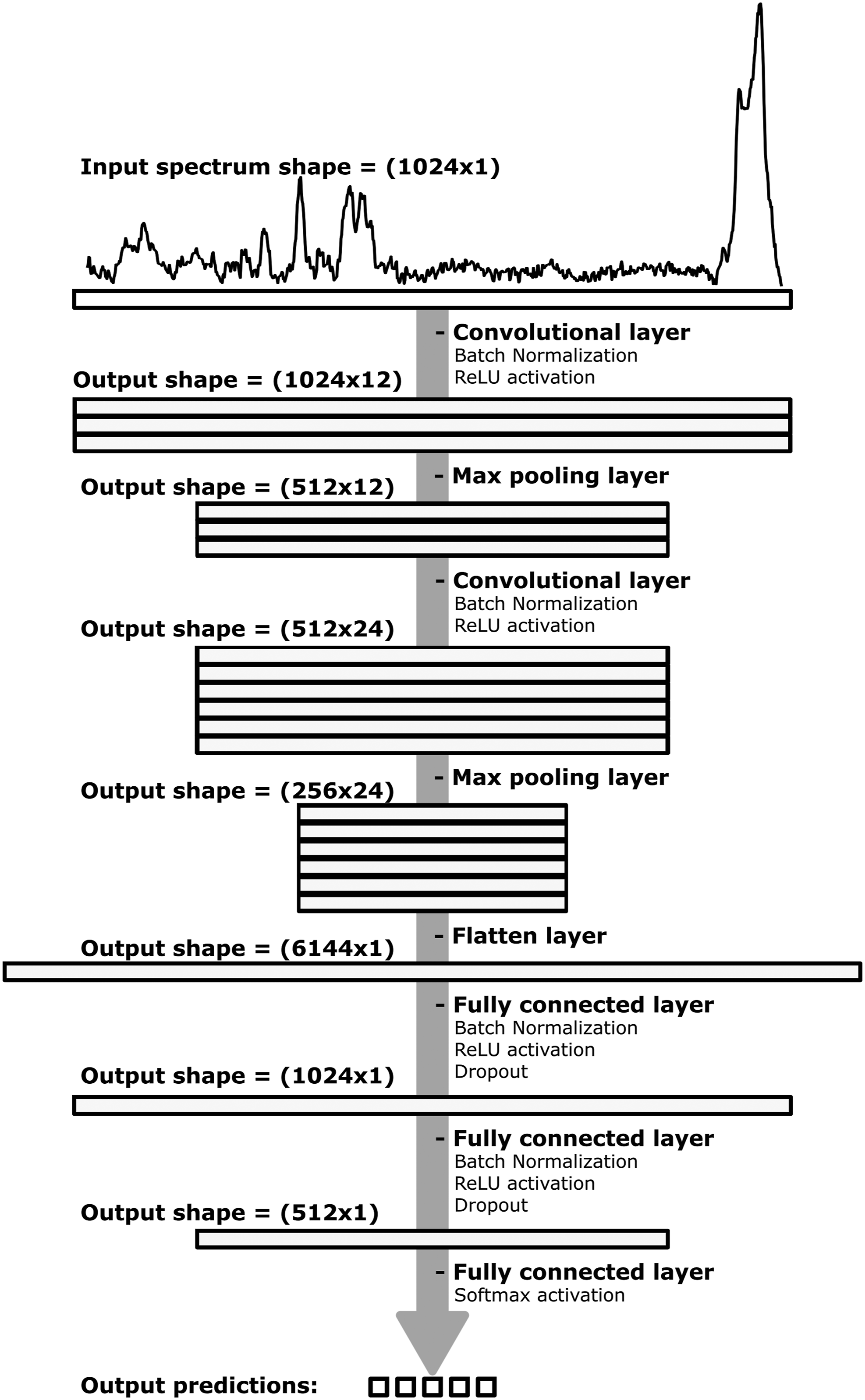Training duration was restricted to a maximum of 50 epochs with a programmed early stop to interrupt the training when the model no longer improves. To monitor the model’s performance during the learning process, both loss and accuracy were evaluated after each epoch on the training and validation sets to ensure that it generalized well to the new spectra and did not overfit during the process (Fig. S3, Supplemental Material, for examples of loss and accuracy learning curves obtained during CNN training). For comparison purposes, a PCA-LDA model based on 10 principal components (∼95% of the cumulative covariance) was also developed using the basic frameworks provided by the Python Scikit-Learn library. Representation of the architecture of the convolutional neural network (CNN) model. From top to bottom, the model includes two convolutional layers, 12- and 24-kernel filters (filter size = 5 × 1), each followed by a max-pooling layer, and two fully connected layers of 1024 and 512 nodes.