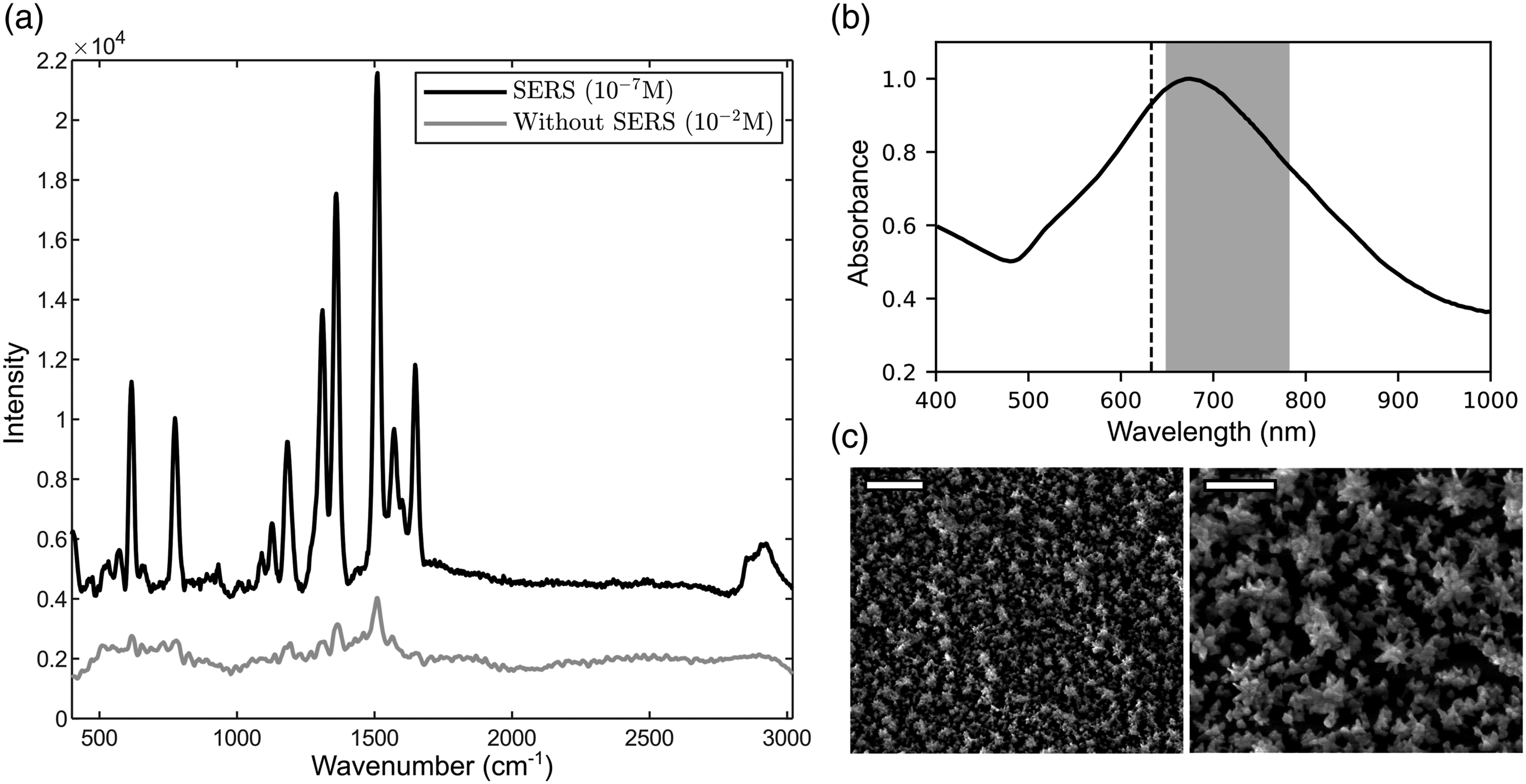 Sizable SERS enhancement is expected from these AuNSt since their absorbance band (Fig. 3b) is centered at 706 nm and covers both the excitation wavelength of 632.8 nm and the measured Raman region from 650 to 780 nm.