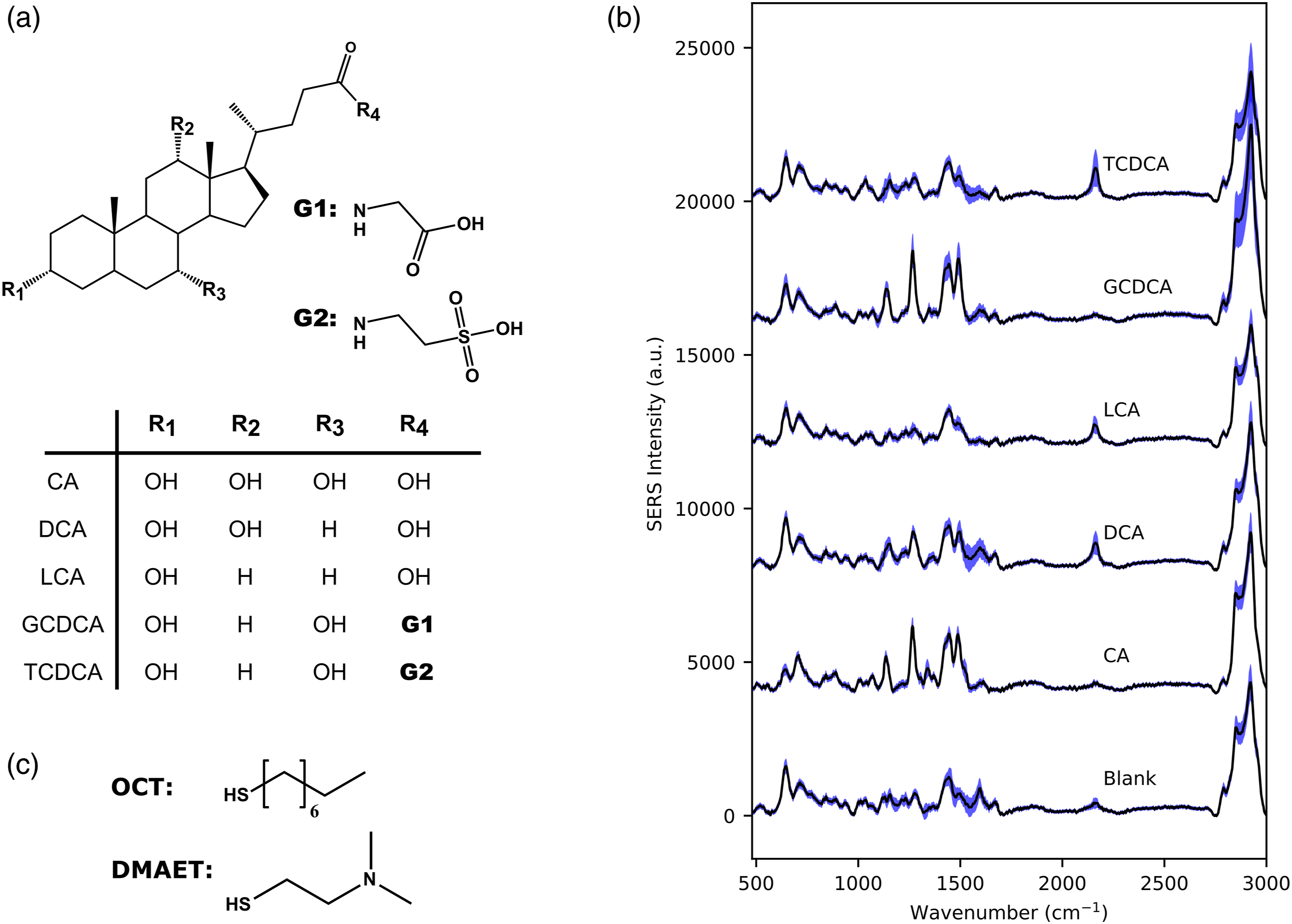 Most studies on bile acid profiling published to date have used mass spectrometry combined with liquid chromatography (LC-MS).12,13 Although LC-MS provides excellent sensitivity and selectivity, it requires considerable expertise and expensive instrumentation. Moreover, whereas these approaches are usable only for fecal profiling, most of the BAs secreted in the intestine are reabsorbed in the ileum and returned to the liver through the portal circulation. 6 Thus, profiling bile acids in feces unavoidably provides inaccurate estimations of their intestinal levels. Therefore, it is urgently needed to implement novel BA measurement technologies allowing for in situ profiling of intestinal bile acids. To this end, SERS is an interesting candidate for BA profiling as it is relatively fast and requires simpler and less expensive simple instrumentation.