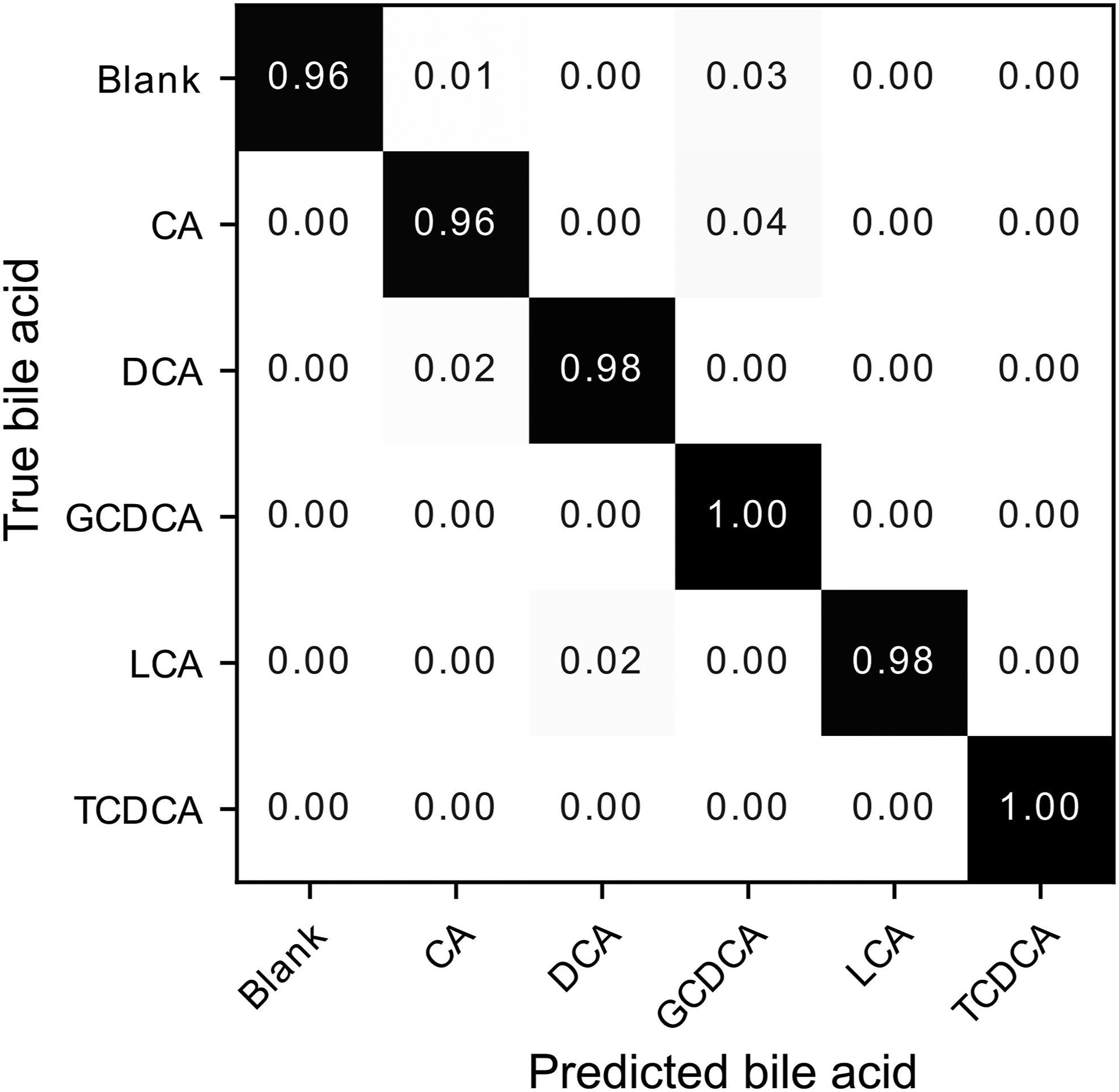 The confusion matrix also shows that the two most problematic bile acids are GCDCA and CA. For the GCDCA, the CNN model correctly classified all its true spectra, but erroneously assigned 4% and 3% that should have been assigned to CA and the blank substrate. These results suggest that the predictions of the CNN model are less accurate for GCDCA than for the other bile acids. For CA, the model correctly classified 96% of its true spectra and erroneously assigned 2% and 1% that should have been assigned to DCA and the blank substrate. The CNN model predictions assigned to CA are more accurate than those of the GCDCA, but the model is less sensitive and fails to correctly detect all of the true CA spectra.
