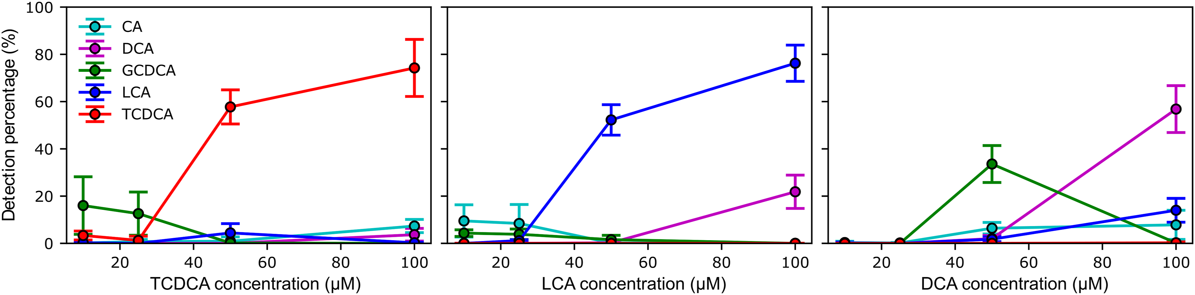 Finally, the CNN model was also tested with solutions of single species at lower concentration. Due to their higher classification score (Fig. 5), TCDCA, LCA, and DCA bile acids were used for SERS measurements at different concentrations. It should be pointed out that whereas TCDCA is structurally distinguishable by its amide and sulfonate groups, the molecular structure of DCA and LCA is almost identical, differing by a single hydroxyl group. To this end, the model was fine-tuned to improve its predictive performance with respect to experimental variations between the spectra from the training set and the spectra from this experiment. This procedure consisted in re-training the pretrained CNN model with an additional training set consisting of new spectra measured on blank substrates and a random set of 30% of the spectra used for the previous training. To preserve most of the CNN model parameters optimized during the first training, the weights of the first layers (convolutional and maxpooling layers) were frozen during the fine-tuning process while the learning rate and number of epochs were reduced to 0.0001 and 5 epochs, respectively. As shown in Fig. 6, the CNN model was again able to correctly classify spectra for the three bile acids at 100 µM despite slightly different experimental conditions such as the use of different SERS substrates. The model also succeeded to detect TCDCA and LCA at 50 µM, but failed to detect DCA, confusing it with GCDCA. This behavior occurred only for the 50 µM DCA solution, suggesting that the predictions are erroneous for this measurement since GCDCA is not detected on the same substrate at lower or higher concentrations. The confusion matrix (Fig. 5) revealed that a higher number of spectra were misclassified into the GCDCA class during model training. Therefore, several spectra that should have been attributed to the blank substrate or DCA bile acid were likely misclassified as GCDCA. Below 50 µM, the CNN model failed to detect all three bile acids in solution. Importantly, the specificity of the CNN model is demonstrated by the small number of false predictions below 50 µm, with occurrences of spectra attributed to bile acids absent from the solution not exceeding 20%. Percentages detected for each bile acid following model predictions performed on surface-enhanced Raman spectroscopy measurements of single-species solutions of TCDCA, LCA, and DCA at different concentrations (10, 25, 50, and 100 µM). A total of 300 spectra were measured for each concentration. The percentages are averages over the results obtained with 10 independent versions of the trained model and the error bars correspond to the calculated standard deviation.