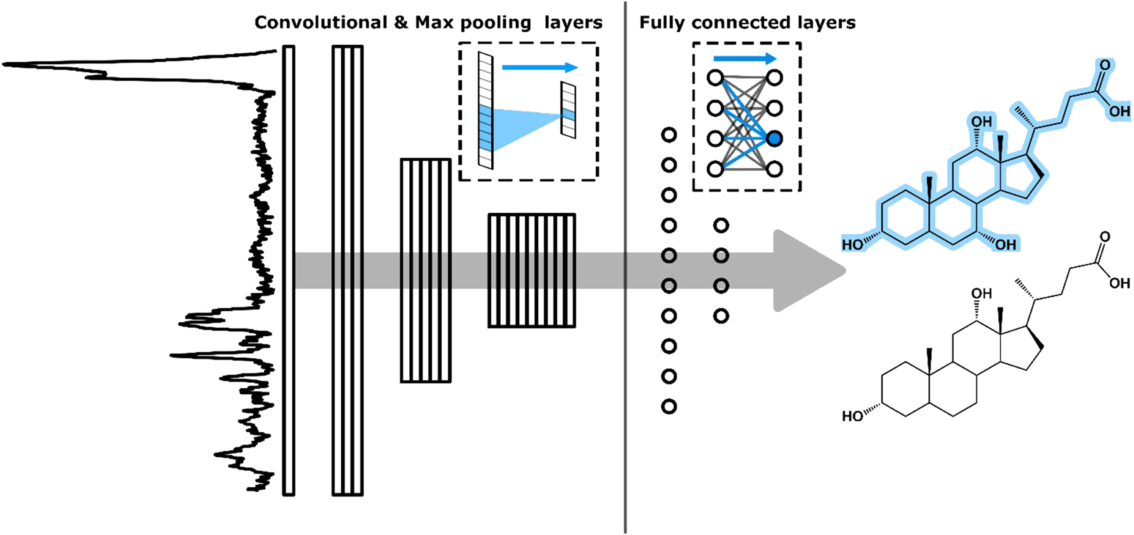 Given the weak SERS spectral signatures and the close similarity between the molecular structures of bile acids, a high-performance model able to capture slight spectral variations was required to identify and classify the SERS spectra of these molecules. CNNs are powerful deep neural networks that are widely used for various tasks such as image classification and speech recognition47–51 and that are also seeing increasing use for the analysis and classification of spectra. Indeed, previous studies have reported that CNN models achieve better results than other classification methods for classifying Raman, Fourier transform infrared, and SERS vibrational spectra. For instance, in SERS, a CNN model was recently used to measure in vitro the gradients of eight metabolites near different cell lines. 52 In another study, a CNN model was applied to distinguish 20 commonly used pesticides. 16 In the present contribution, we are specifically targeting the development and application of a CNN model to the classification of very similar molecular structures, as well as proposing more elaborate data augmentation and fine-tuning methods. Before presenting the performance of our model, a brief overview of the features and capabilities of neural networks and CNNs pertaining to spectral classification is provided in this section.