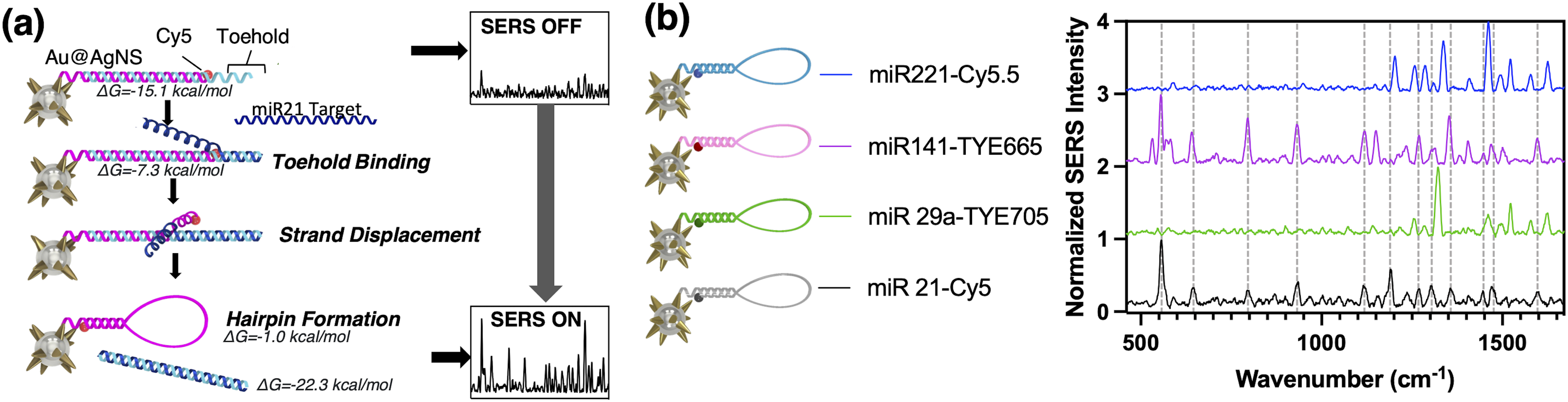 We previously developed the “inverse molecular sentinel” (iMS) plasmonic nanobiosensor assay, which allows for highly sensitive and multiplexed detection of nucleic acids. IMS uses the sensing platform silver-coated gold nanostars (AuNS@Ag). Like gold nanostars, AuNS@Ag have the advantage of sharp tip geometry which produces a highly localized electric field enhancement, but AuNS@Ag produce even greater SERS enhancement over gold nanostars. 21 The nanobiosensor detects a target nucleic acid sequence with an “off–on” signal produced by a non-enzymatic DNA strand-displacement process and stem-loop formation (Figure 1a). The nanobiosensor produces signal switching based on the spatial dependence of SERS intensity and involves two DNA probes: stem-loop probe and placeholder strand. Stem-loop DNA probes with a Raman label at one end are fixed to AuNS@Ag surface by a metal–thiol bond. As the name suggests, this stem-loop probe is designed to form two distinct geometries, switching the SERS signal on or off by bringing the Raman reporter physically closer or farther from the metallic surface. In the SERS OFF configuration, the stem-loop probe is hybridized to the placeholder strand with an overhang called the “toehold”. The target miRNA binds to the toehold region, initiating an energetically favorable strand displacement of the placeholder strand due to the higher melting temperature between the target and placeholder. This leaves the stem-loop probe to form a hairpin geometry, bringing the Raman dye close to the metallic surface and producing a strong SERS signal (SERS ON).